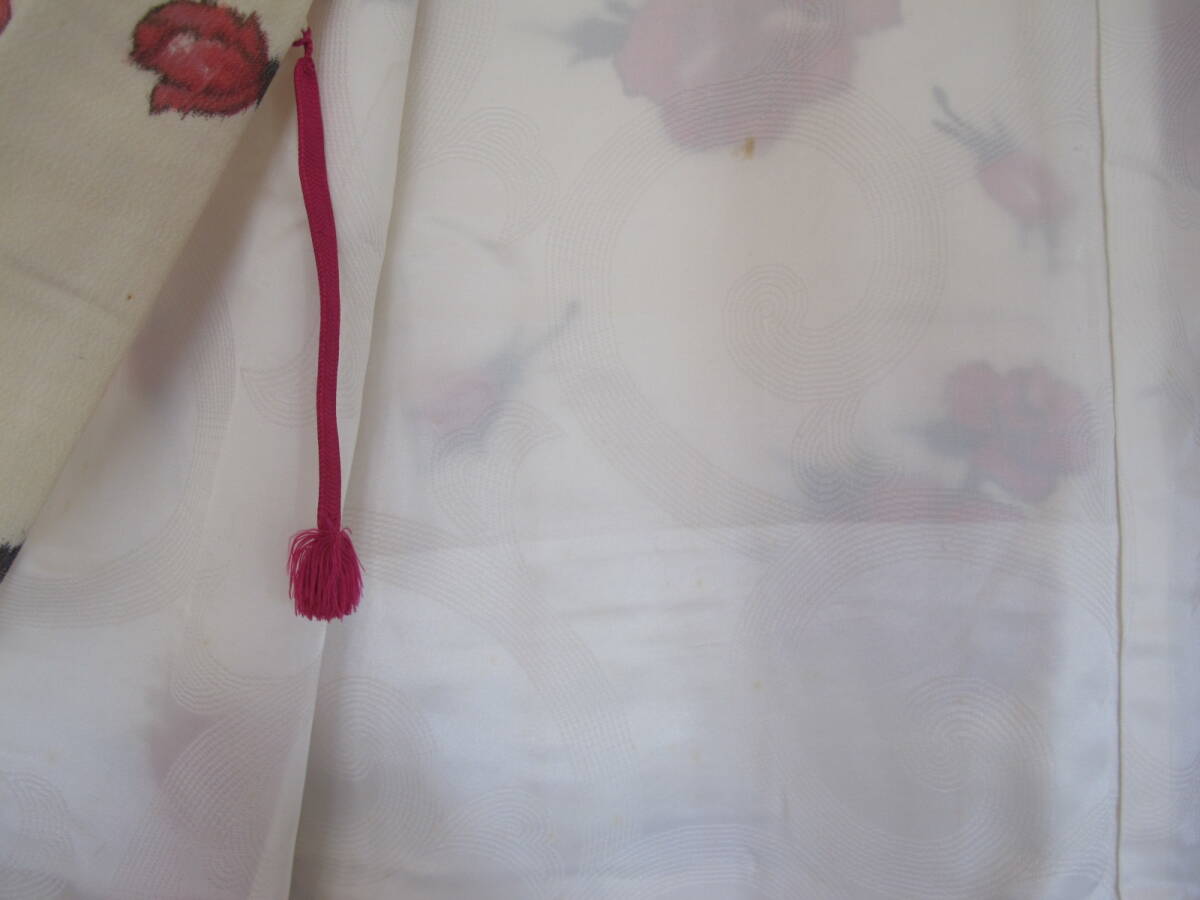 おおよその丈:身丈(肩)75cm、裄62.5cm、袖丈47cm、袖幅31.5cm、前幅17cm、後幅28.5cm 素材:正絹 お色:生成り~薄クリーム |