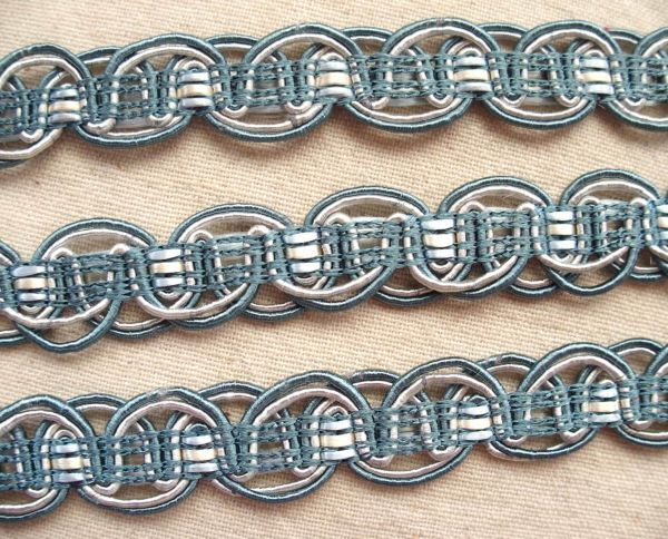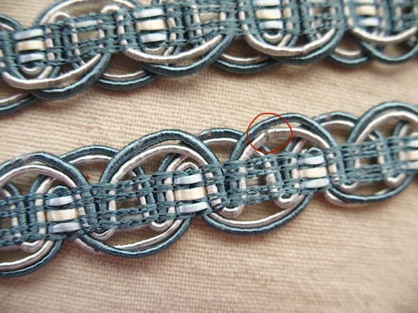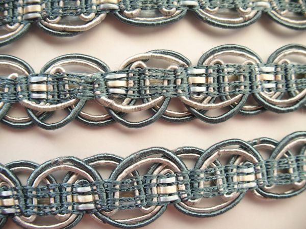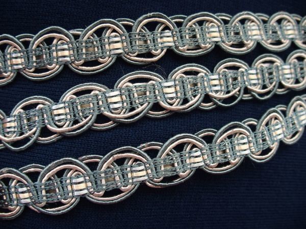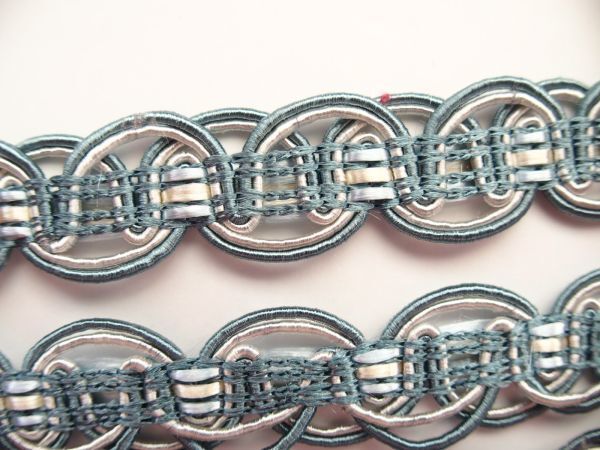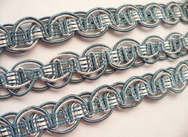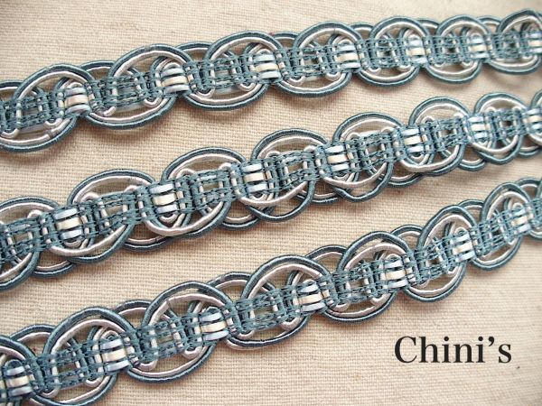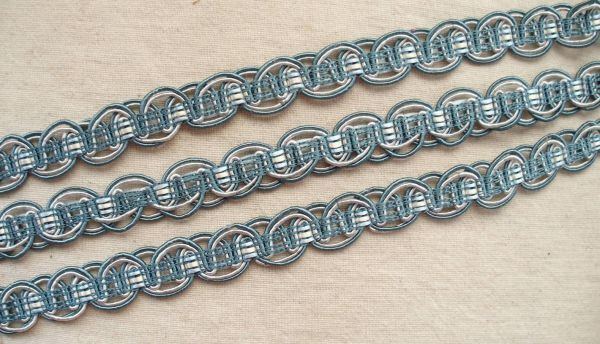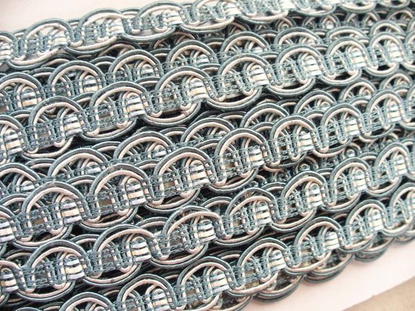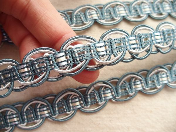 ブルーグレーと白の艶のあるコードで複雑な模様に織られたテープです。