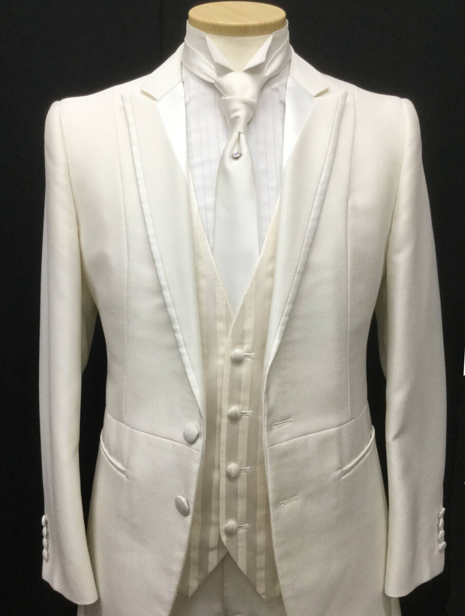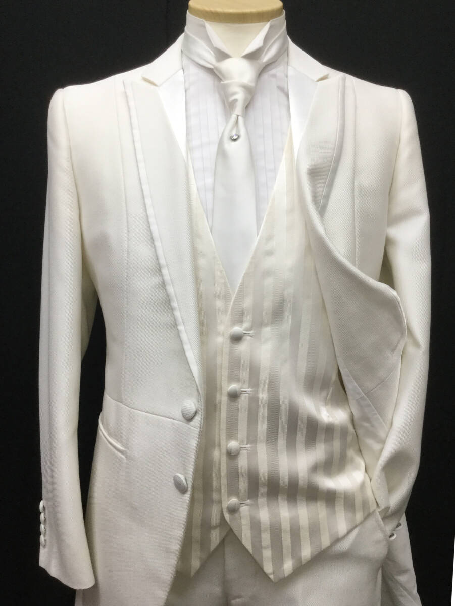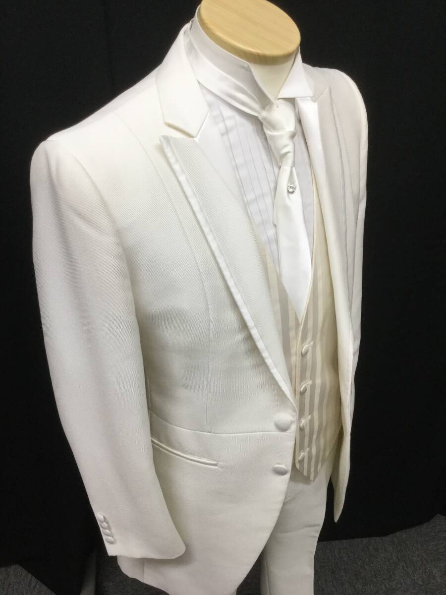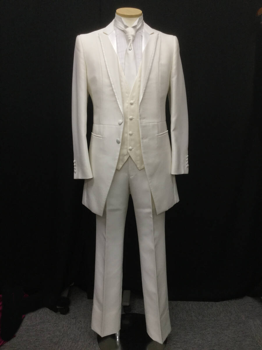 AB-Mサイズ★純白に近いオフ白タキシード★ベストはストライプ柄、タイはサテンのクリスタルピン付 貸衣裳店で使用・手入れされていたタキシード 専門店の商品ですので、状態は良いほうです タグブランドは「Prima Qualita」 純白に近いオフ白、極細かな網目状の織生地 剣衿、内衿とパイピングは白のサテン生地 素材はポリ70%ウール30% 左胸のポケットは剥ぎにそって縦にカットされている 上のボタン下に横に剥ぎが入ったデザイン 左右のポケットは飾りで口にパイピング ボタンは包みで前2ヶ、袖口に4ヶづづ 前裾は少しカットされて広がる感じ ベストは少しオフかアイボリーに見える太めのストライプ シルク50%素材で包みボタン パンツはすっきりとしたノータック ウエストにアジャスターが付いてサイズ調節可 タイは内衿と同じサテン生地、中央にクリスタルのピンが付いて、ワンタッチの着脱式 【注意】写真のYシャツはセットではありません 写真は同型の別タキシードのものを利用、色デザインとも同じです モニター等により色合いが現品と多少違って見えます 【寸法】AB-Mサイズ 173096 実寸法と計測方法は以下の通りです 着用される方のスーツ等で寸法を確認してください 上着丈81cm位 袖丈60.5cm位 肩裄44.5cm位 ウエスト79~93cm位 股下76.5cm位 【計測方法】 肩巾・・・左右の袖と肩山の縫い付け部を背中側直線で計測 袖丈・・・袖と肩山の縫いつけから袖口までを真下で計測 上着丈・・・衿と背中心縫い付け部から裾までを計測 ウエスト・・・パンツの内側の周囲を計測 股下・・・・股の付け根から裾までを真下で計測 ※ヌード寸法ではありません現品を当方で実測しています ※多少の誤差はあると思います 【状態について】 たたんだ状態での入荷保管の為、多少たたみシワがあります その他、特に目立ったシミ汚れ等はありません 十分ご利用いただける商品です ただ、あくまでも貸衣裳店で使用していた中古品です こちらで見落とした小さなシミ汚れがあるかもしれません ご了承の上でご入札下さい | |||