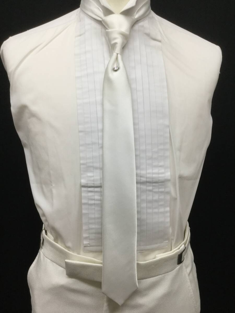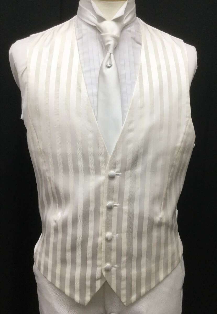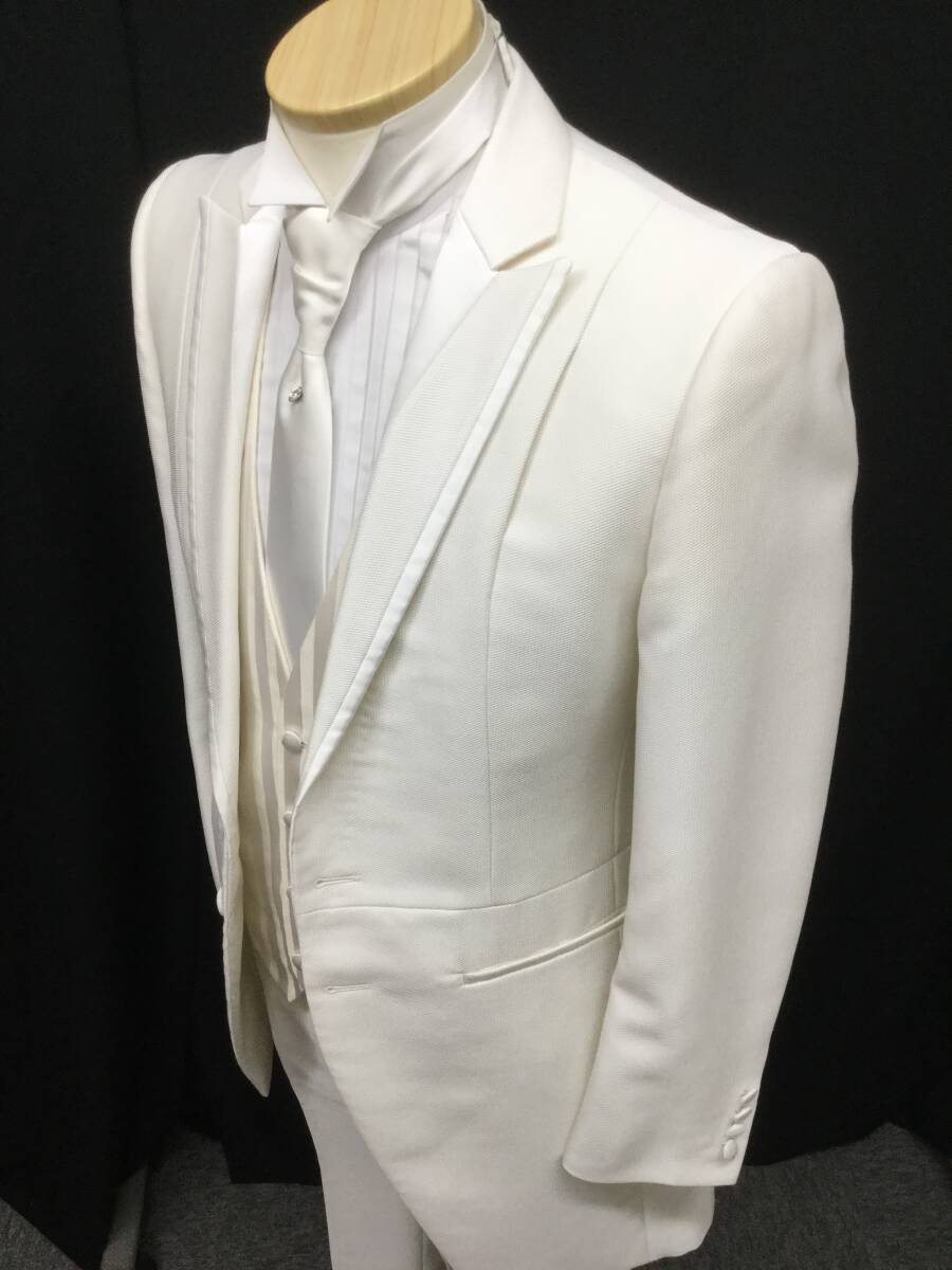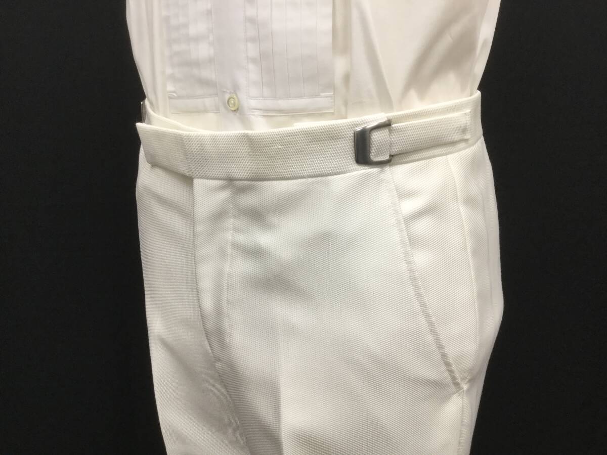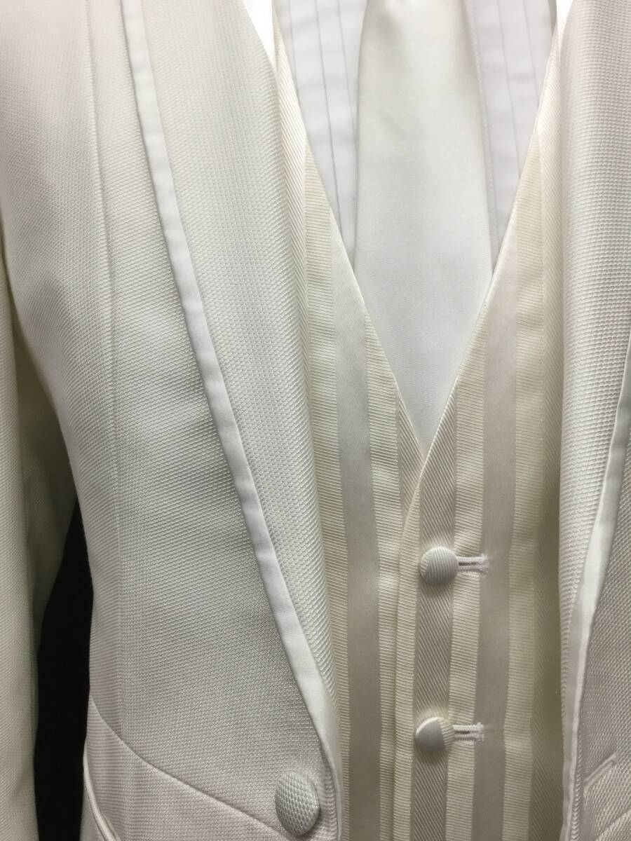 AB-Mサイズ★純白に近いオフ白タキシード★ベストはストライプ柄、タイはサテンのクリスタルピン付 貸衣裳店で使用・手入れされていたタキシード 専門店の商品ですので、状態は良いほうです タグブランドは「Prima Qualita」 純白に近いオフ白、極細かな網目状の織生地 剣衿、内衿とパイピングは白のサテン生地 素材はポリ70%ウール30% 左胸のポケットは剥ぎにそって縦にカットされている 上のボタン下に横に剥ぎが入ったデザイン 左右のポケットは飾りで口にパイピング ボタンは包みで前2ヶ、袖口に4ヶづづ 前裾は少しカットされて広がる感じ ベストは少しオフかアイボリーに見える太めのストライプ シルク50%素材で包みボタン パンツはすっきりとしたノータック ウエストにアジャスターが付いてサイズ調節可 タイは内衿と同じサテン生地、中央にクリスタルのピンが付いて、ワンタッチの着脱式 【注意】写真のYシャツはセットではありません 写真は同型の別タキシードのものを利用、色デザインとも同じです モニター等により色合いが現品と多少違って見えます 【寸法】AB-Mサイズ 173096 実寸法と計測方法は以下の通りです 着用される方のスーツ等で寸法を確認してください 上着丈81cm位 袖丈60.5cm位 肩裄44.5cm位 ウエスト79~93cm位 股下76.5cm位 【計測方法】 肩巾・・・左右の袖と肩山の縫い付け部を背中側直線で計測 袖丈・・・袖と肩山の縫いつけから袖口までを真下で計測 上着丈・・・衿と背中心縫い付け部から裾までを計測 ウエスト・・・パンツの内側の周囲を計測 股下・・・・股の付け根から裾までを真下で計測 ※ヌード寸法ではありません現品を当方で実測しています ※多少の誤差はあると思います 【状態について】 たたんだ状態での入荷保管の為、多少たたみシワがあります その他、特に目立ったシミ汚れ等はありません 十分ご利用いただける商品です ただ、あくまでも貸衣裳店で使用していた中古品です こちらで見落とした小さなシミ汚れがあるかもしれません ご了承の上でご入札下さい | |||