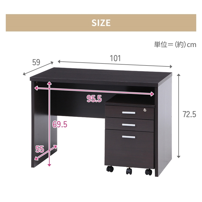 | 約デスク:幅101×奥行59×高さ72.5cm チェスト:38.5×40×55cm 天板・地板厚:2.2cm 棚板厚:1.2cm |