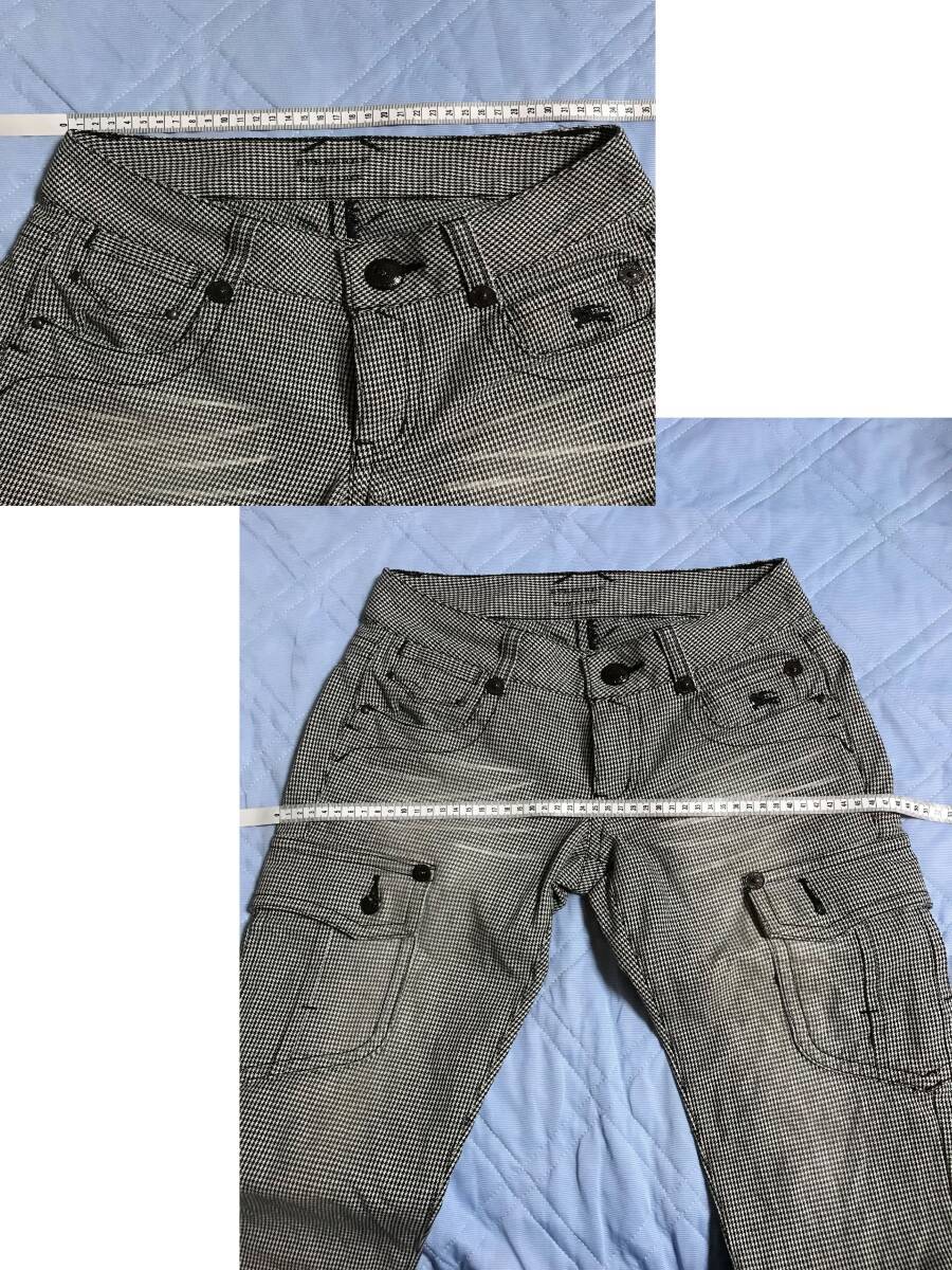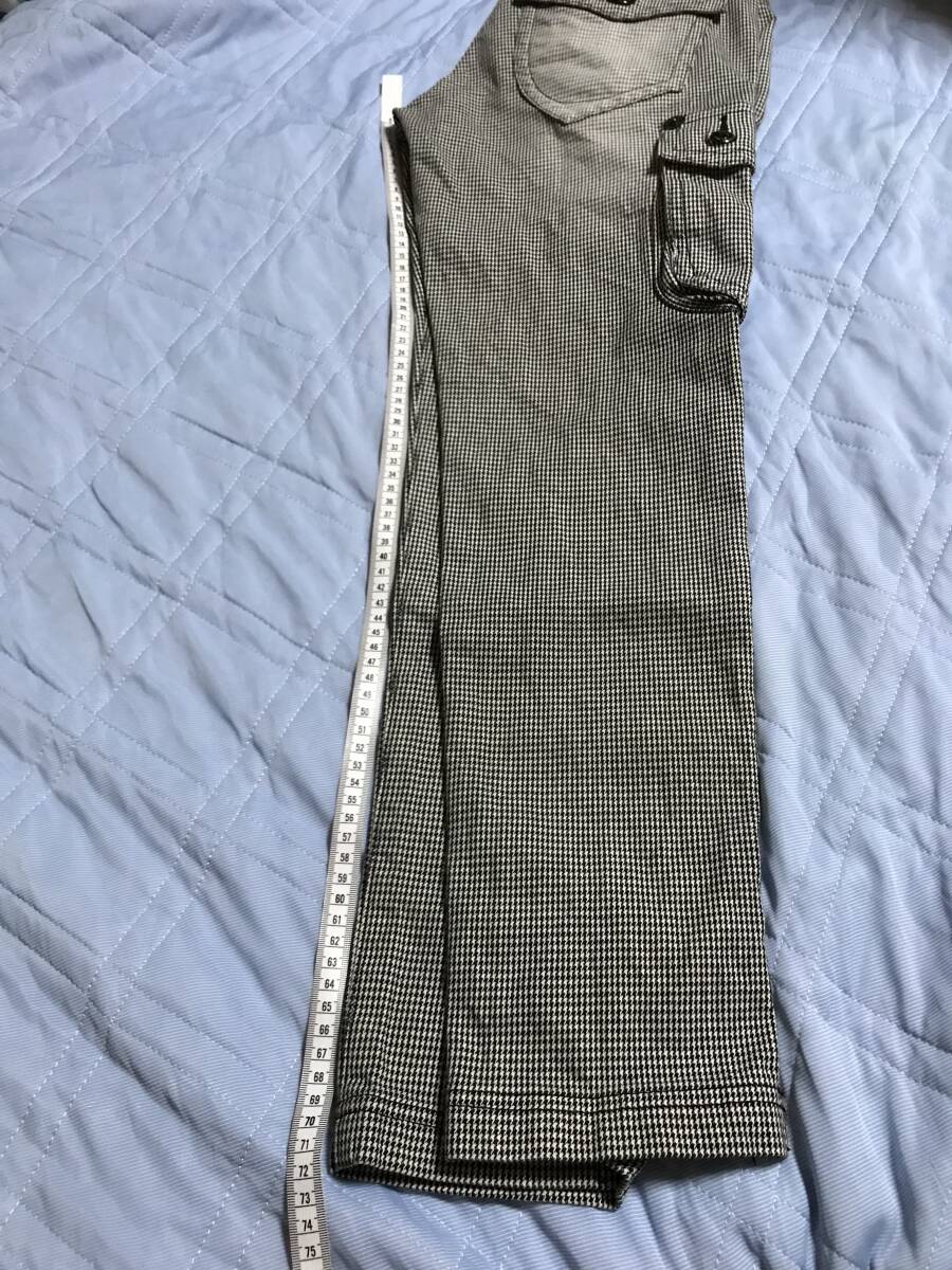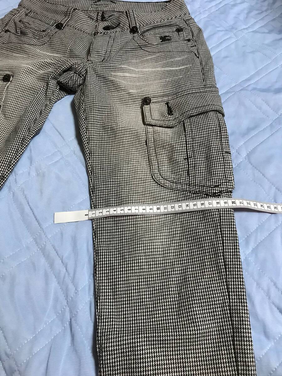 ・黒白細かな格子柄、綿99%、サイドにカーゴ風リアルポケットのあるデザインのパンツです。