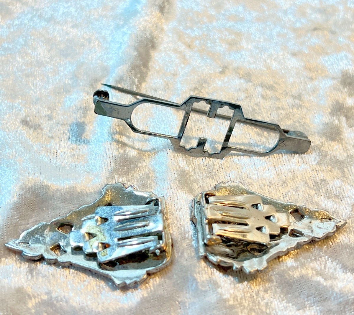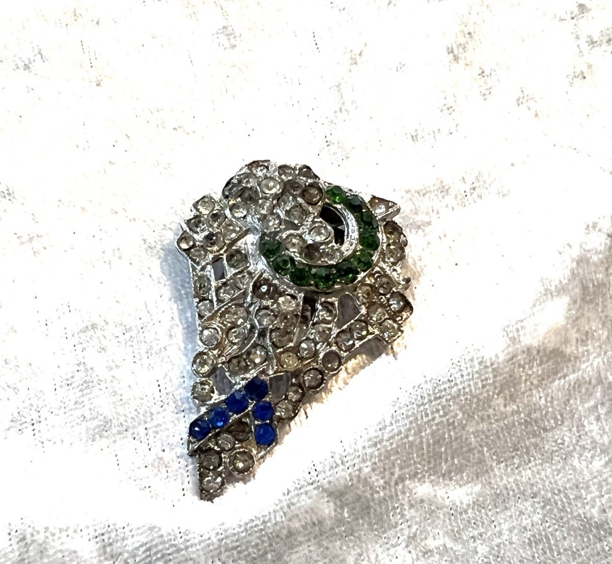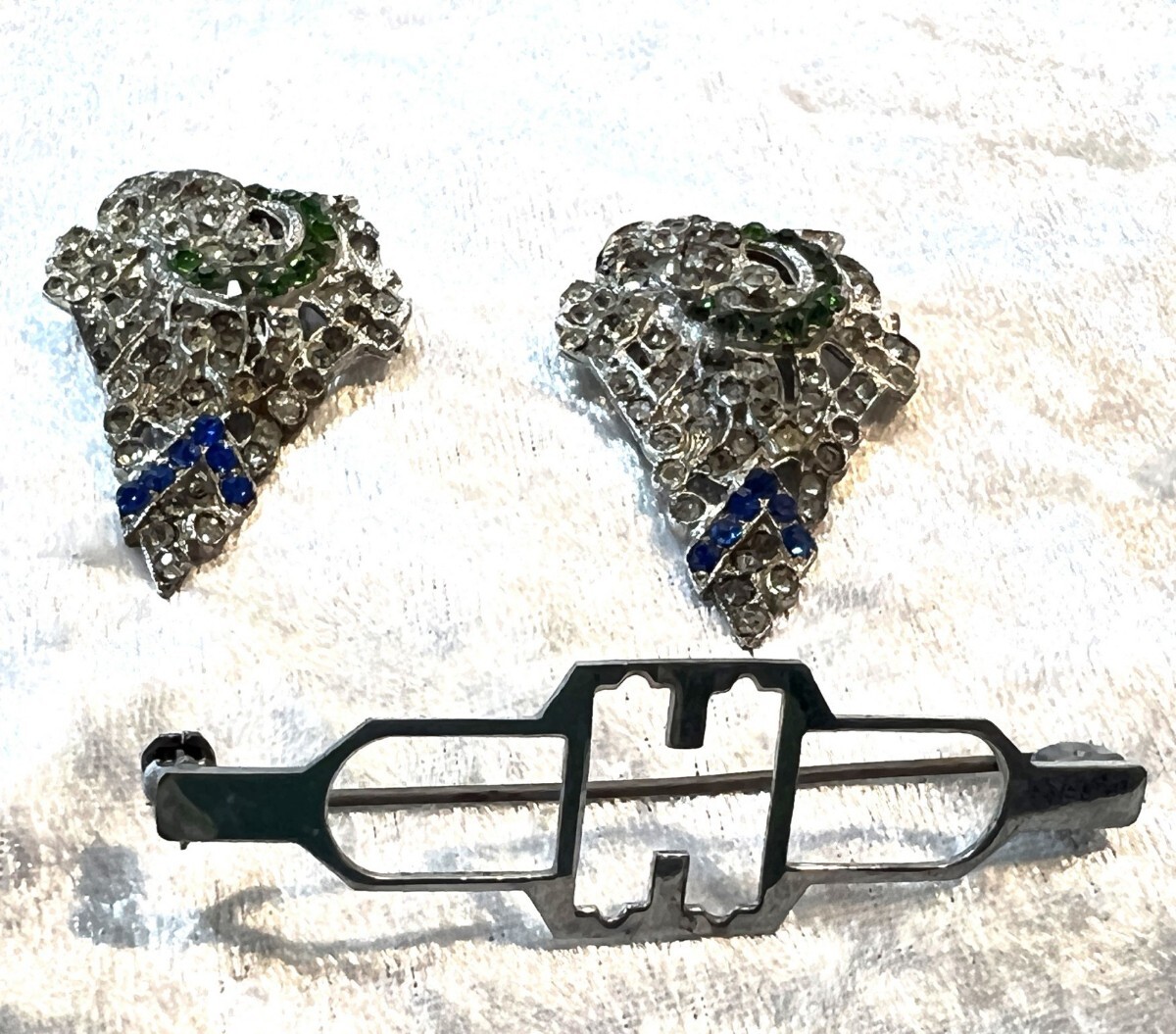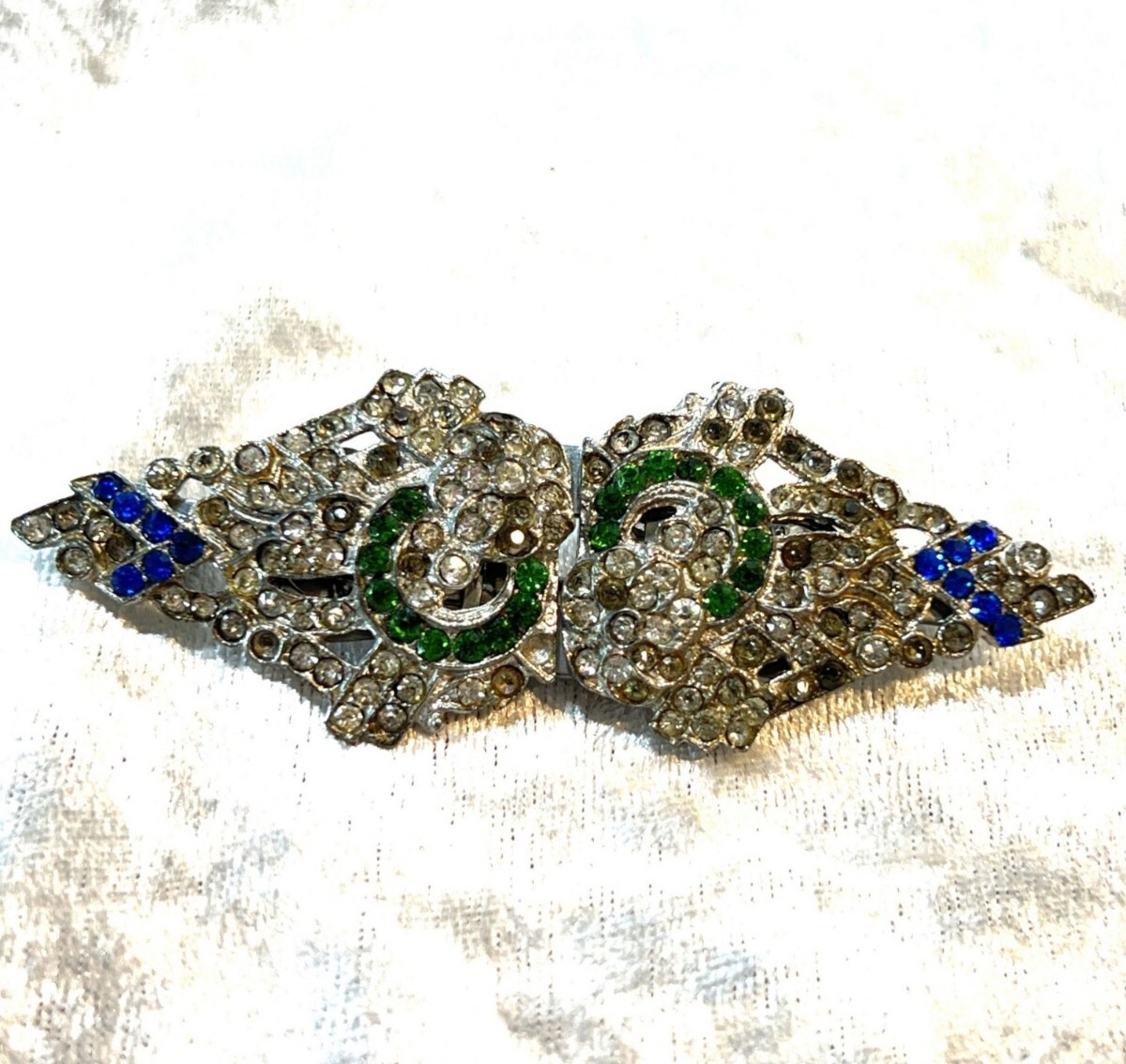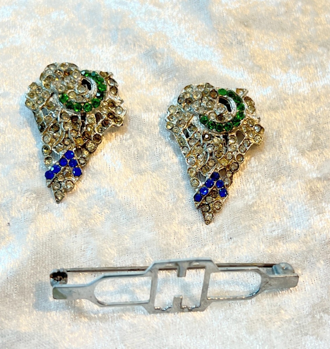 【アクセサリー】ダブルクリップブローチ シルバー 刻印あり グリーンとブルーカラー コスチュームジュエリー おしゃれアイテム ビンテージ商品説明+++ 商品名:ダブルクリップブローチ