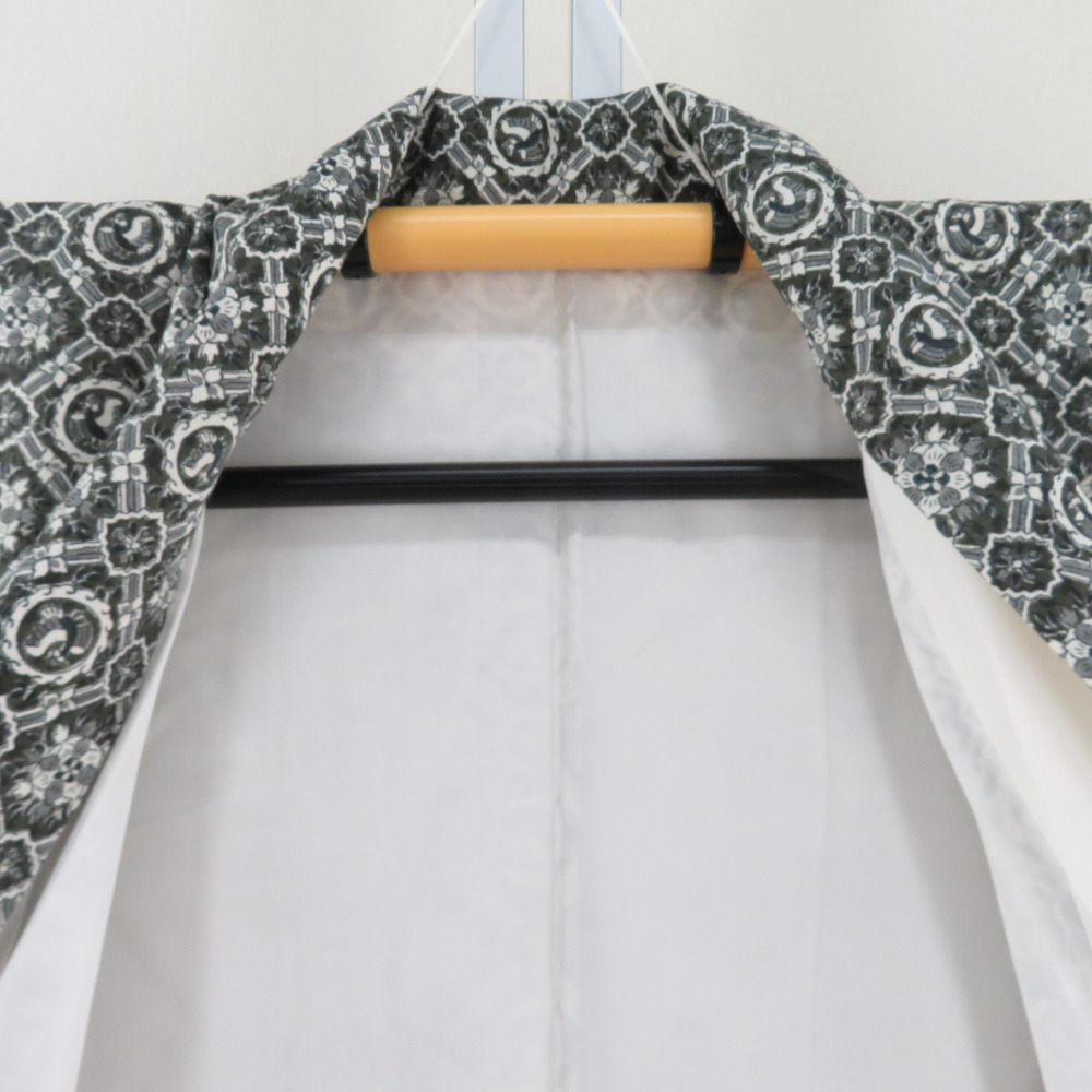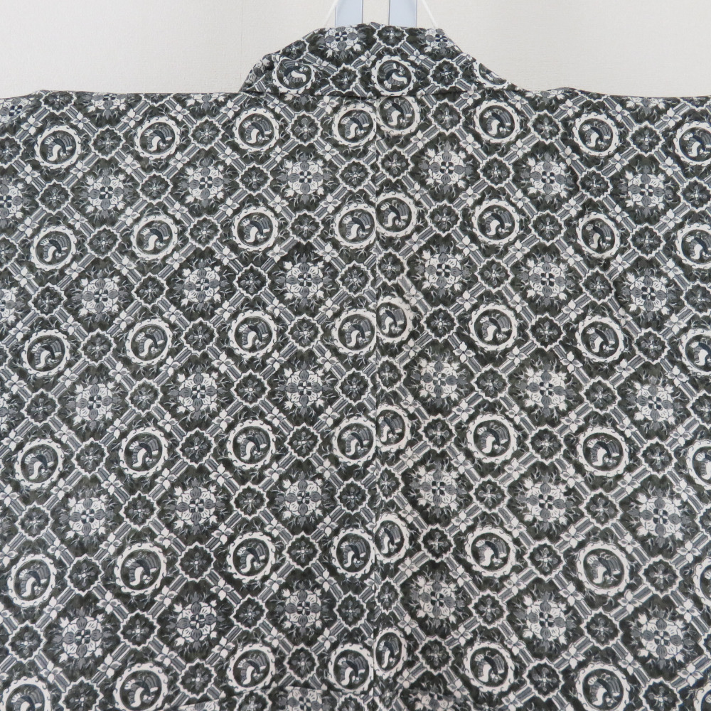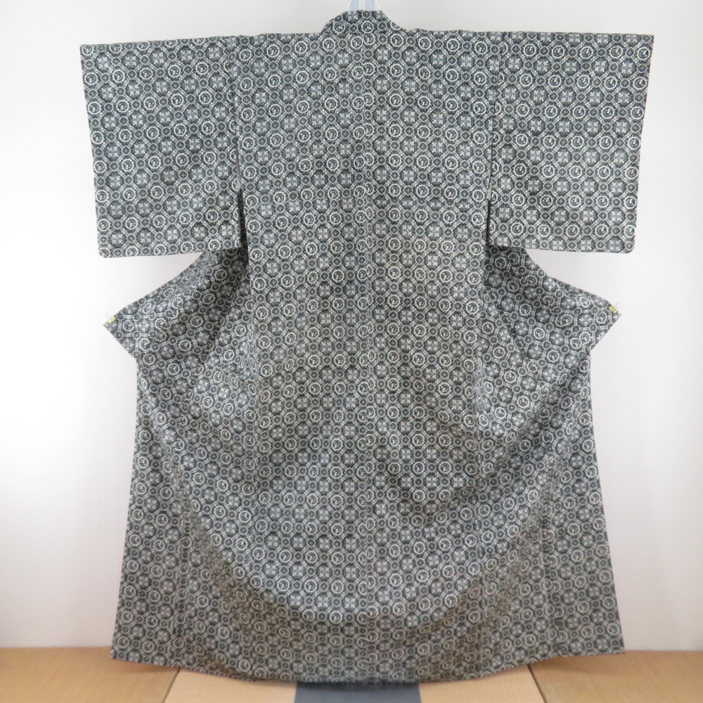 | 小紋 白x黒x灰色x深緑 鳥紋模様 正絹 広衿 仕立て上がり着物 身丈160cm |