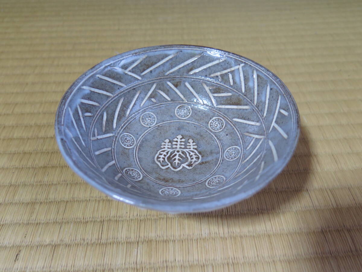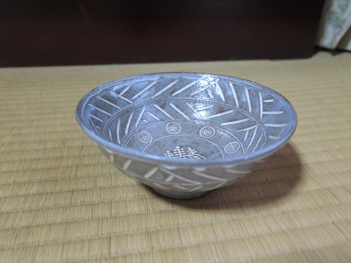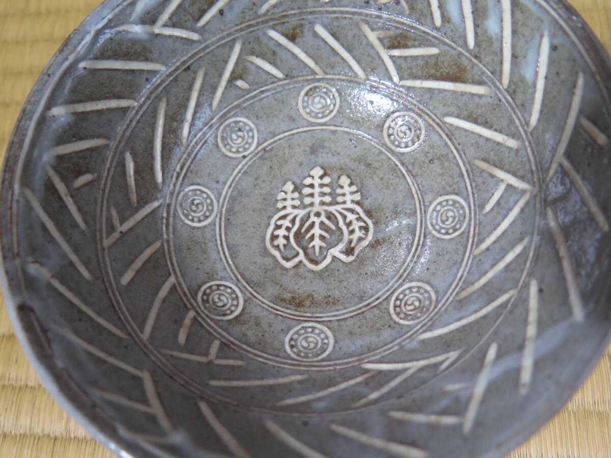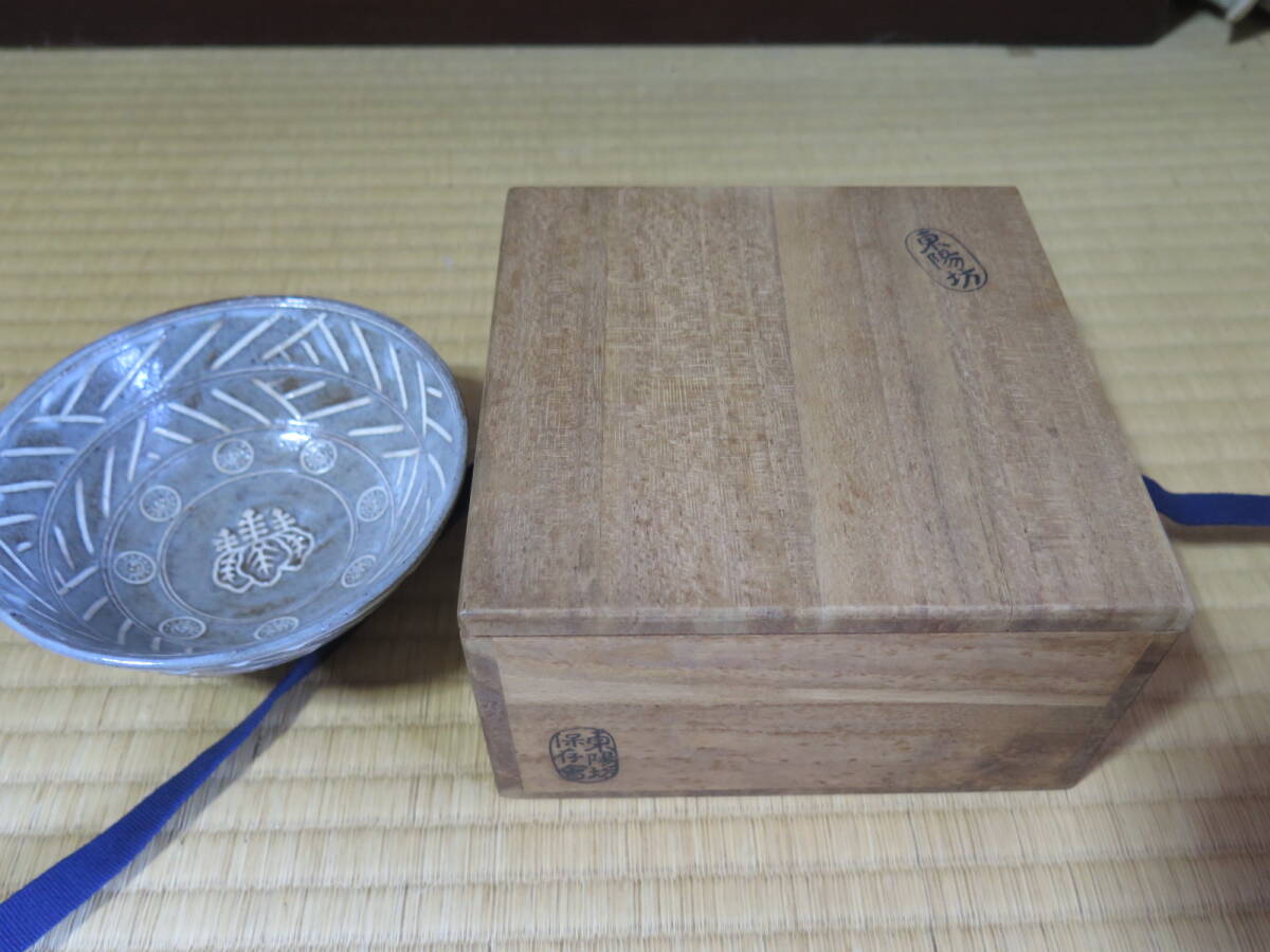 久世久宝、桐紋入彫三島茶碗、共箱、近藤宗恵、書付き、東陽坊保存会印有り