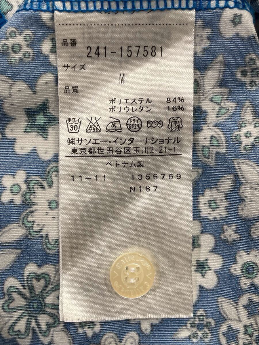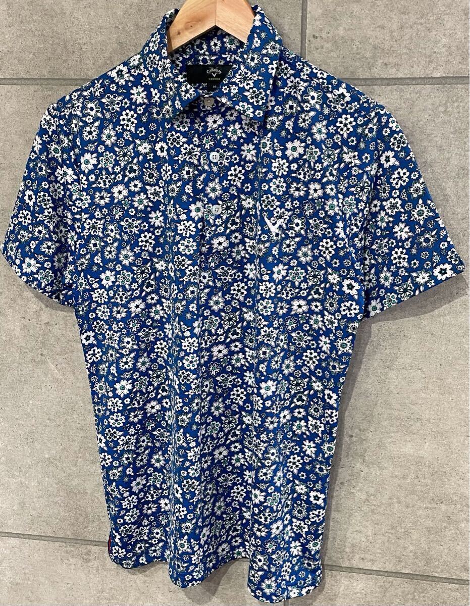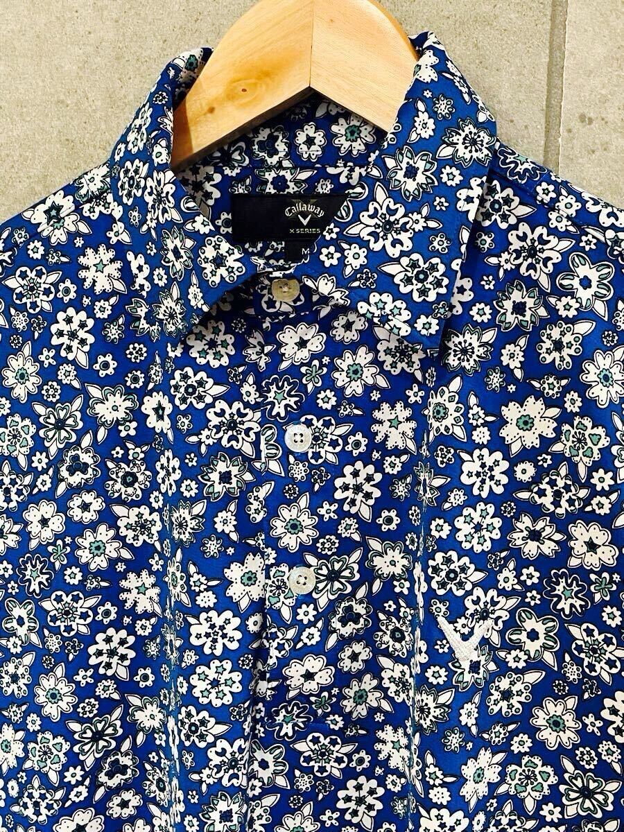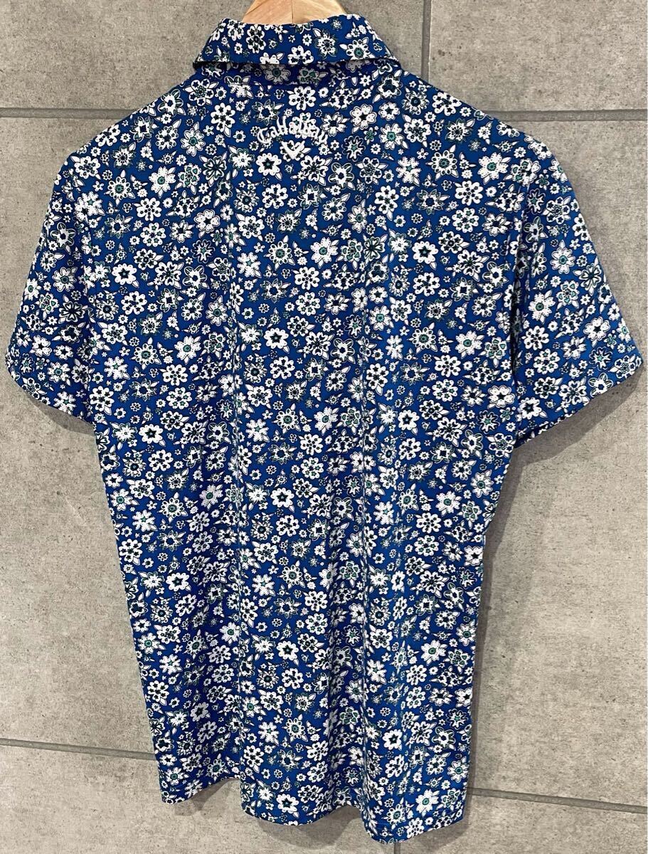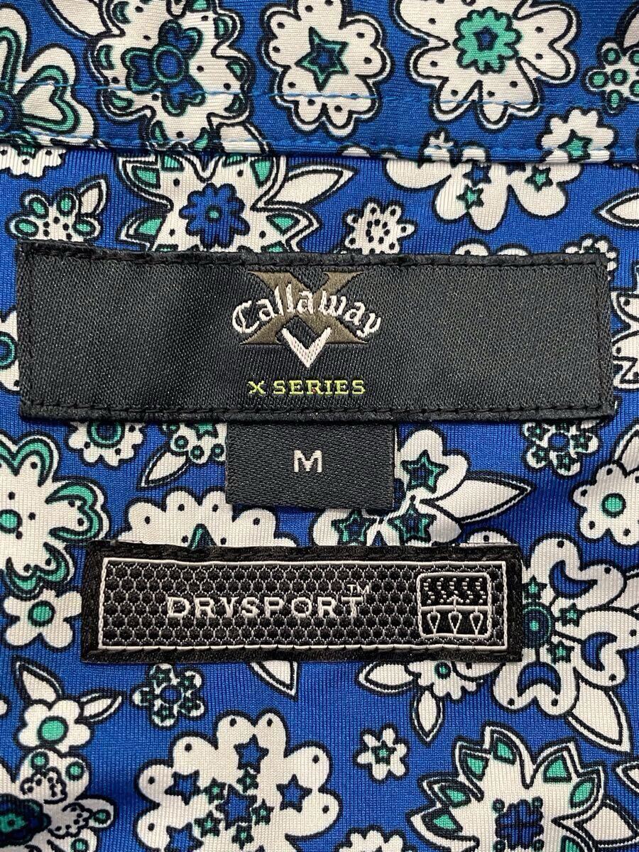 夏を感じるデザイン! Callaway キャロウェイ ストレッチ 半袖ポロシャツ 総柄 花柄 ブルー Mサイズ ウェア レターパック可 ○ 新規×