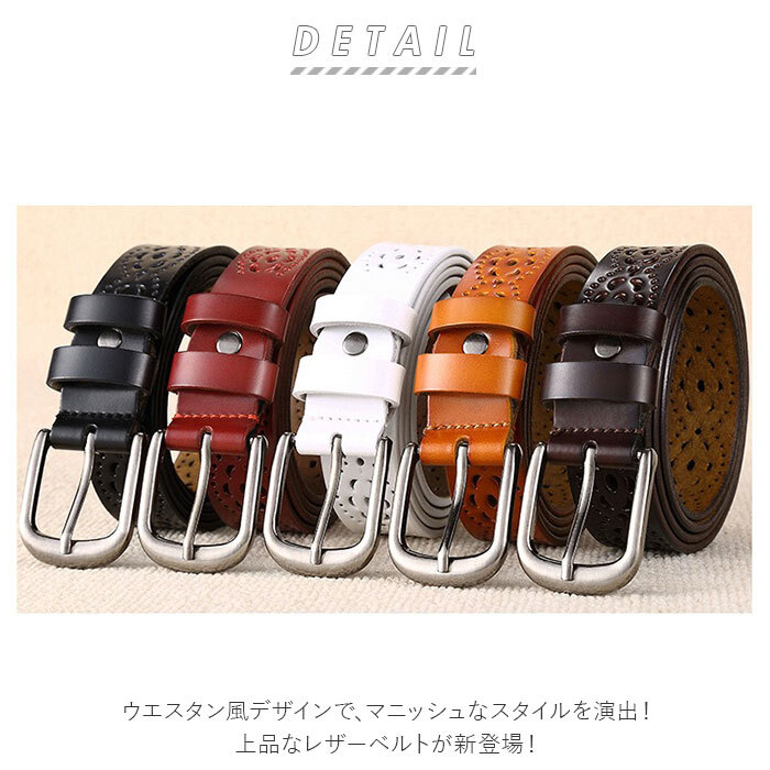 | 商品説明 | ・ウエスタン風デザインで、マニッシュなスタイルを演出!上品なレザーベルトが新登場! ・メタリック調バックルは敢えて装飾を削ぎ落としてシンプルに。柔らかな質感のベルト生地には、オルテガ調モチーフの型抜きを施したスタイリッシュなデザイン! ・オルテガモチーフの中心がベルト穴になっているため、新たにベルト穴を空ける必要がなく、サイズ調整が自在。 ・身に着ける程に身体にフィットする本革仕様。ベルト生地表面は、くすみ感が味わい深い上品なアンティーク調仕上げ。 ・ジーンズスタイルやテンガロンハットと合わせて、よりワイルドに。モノトーンのワンピースやルーズなトップスと合わせても、ベルトが個性的なワンポイントになる♪ ・男性でも使いやすいユニセックスデザインなので、カップルでお揃いにしても◎ |