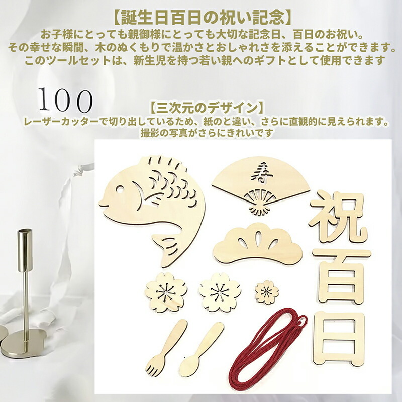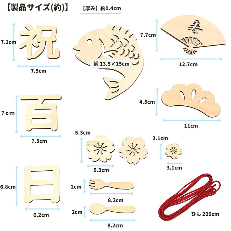 製品内容 百日祝い レターバナー 木製【ウッドバナ:1組(全11枚)、赤いひも:1本(200cm)】