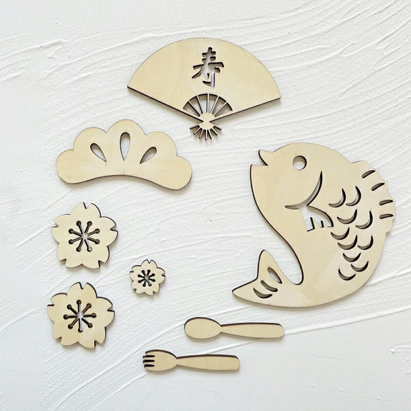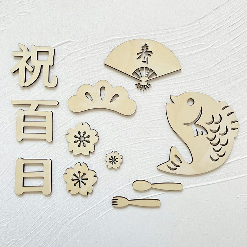 サイズ(約) 百 7.5×7cm / 日 6.2×6.8cm / 祝 7.5×7.1cm / 寿 12.7×7.7cm / 魚 13.5×15cm / フォーク 2×8.2cm / スプーン 2×8.2cm / 花大 5.3×5.3cm / 花小 3.1×3.1cm