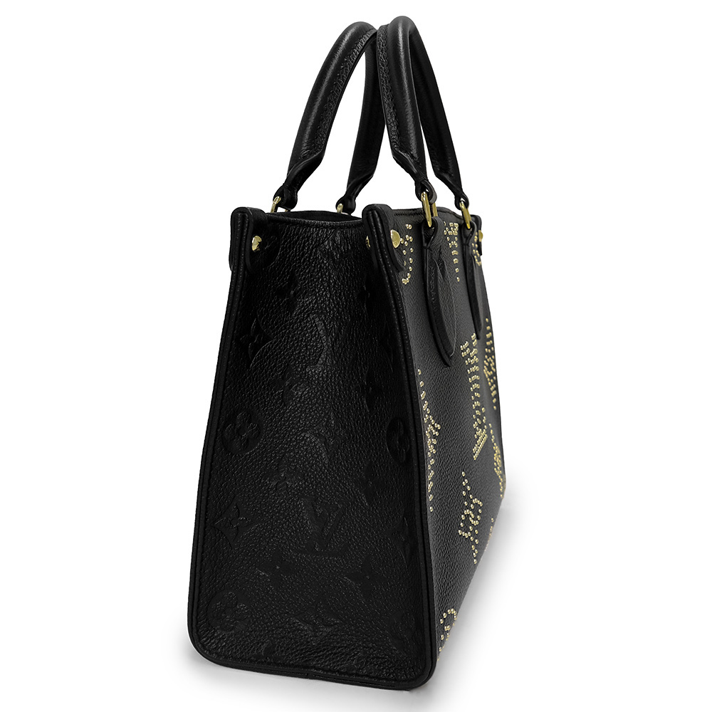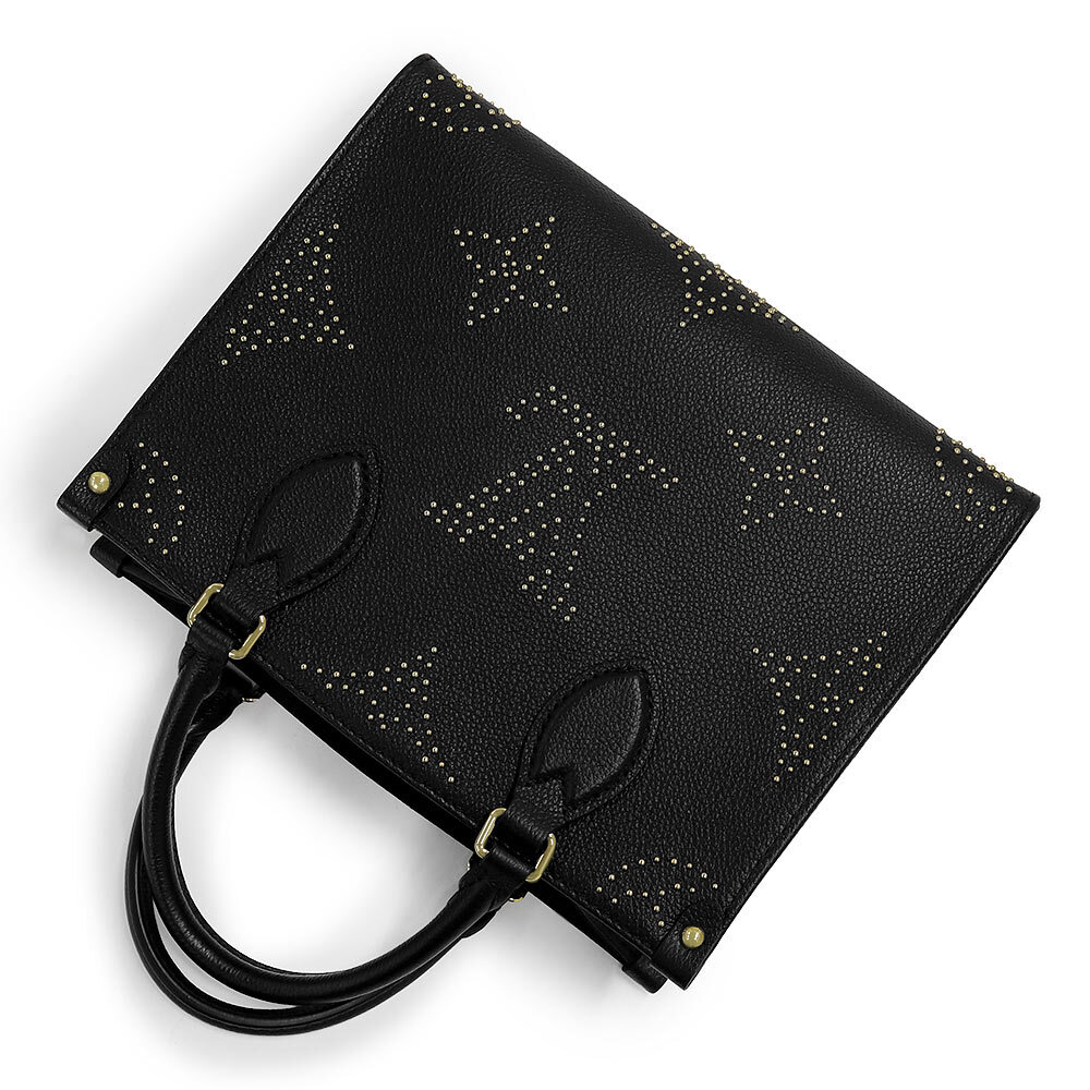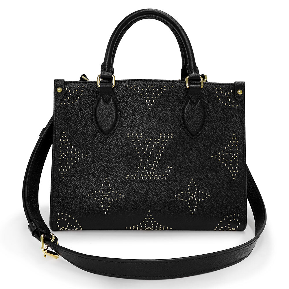 グレインのあるカウハイドレザーで仕立て、ゴールドカラーのスタッズでモノグラム ジャイアント パターンを描いた オンザゴー PM。ダブルハンドルと調節可能なストラップを備えた、さまざまな持ち方をお楽しみいただけます。