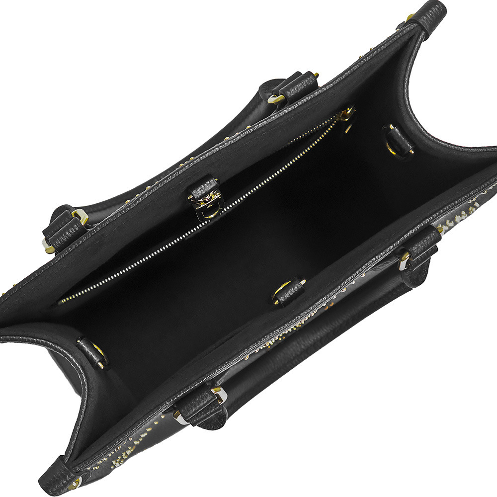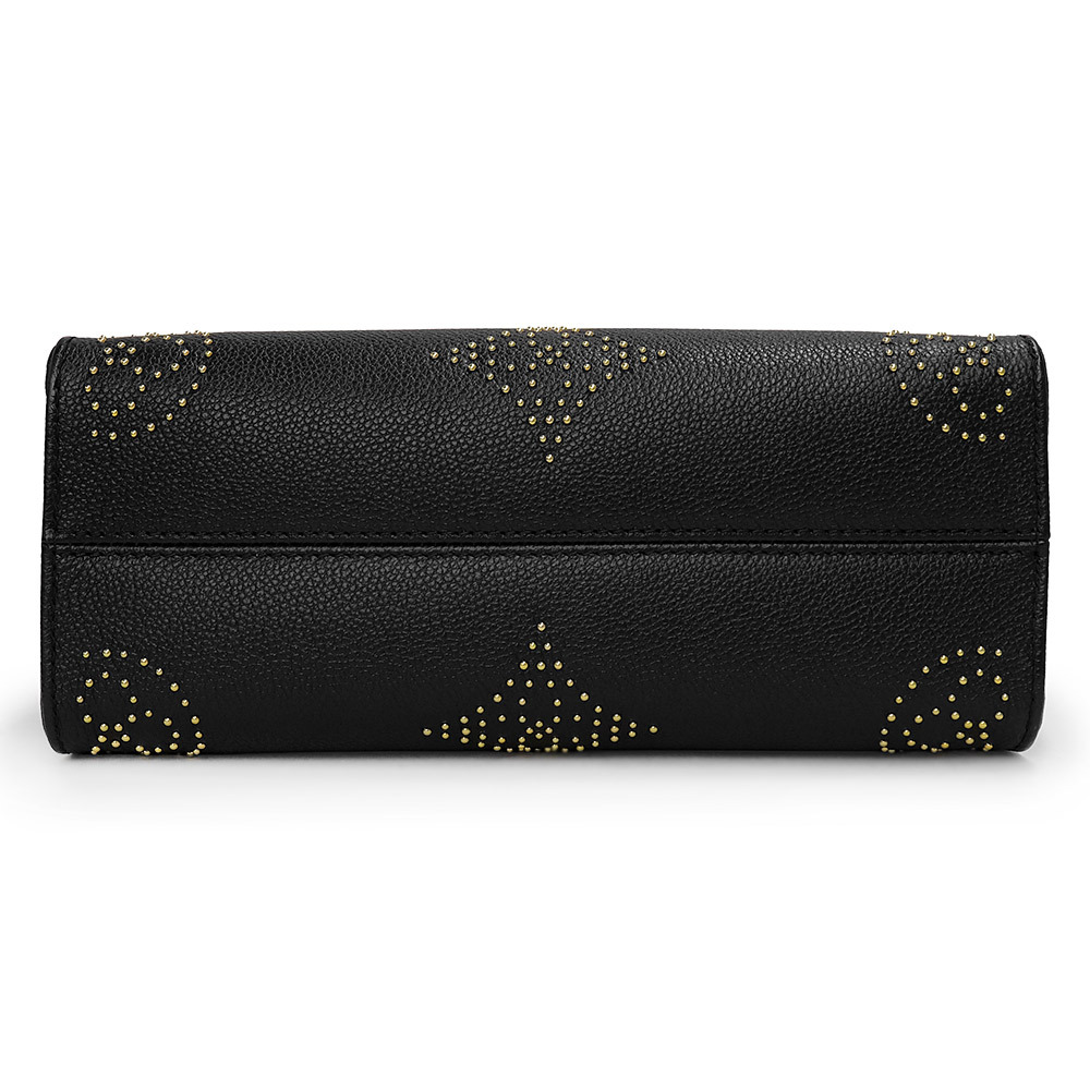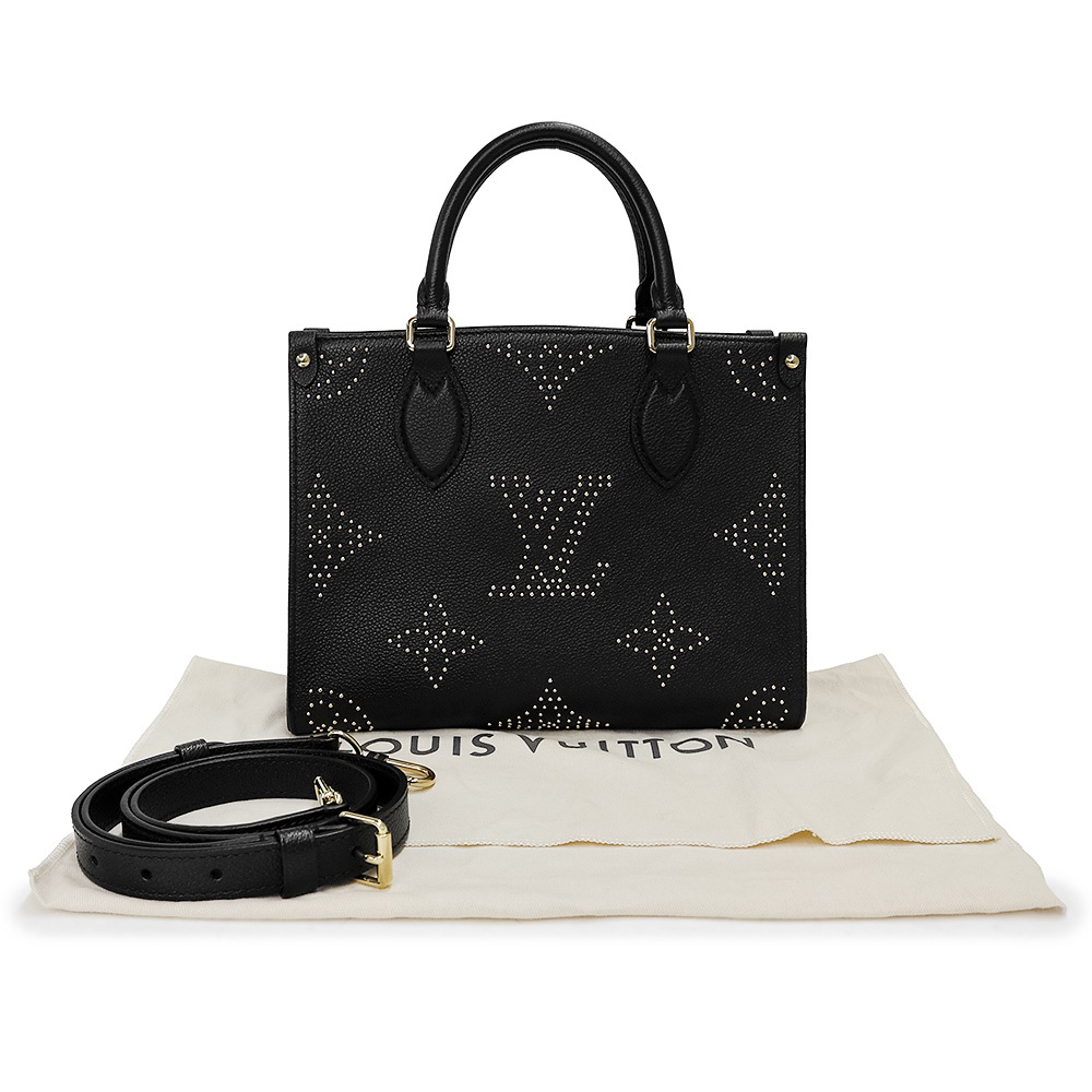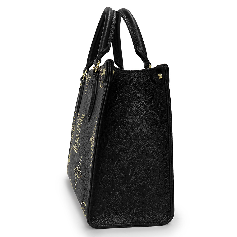 グレインのあるカウハイドレザーで仕立て、ゴールドカラーのスタッズでモノグラム ジャイアント パターンを描いた オンザゴー PM。ダブルハンドルと調節可能なストラップを備えた、さまざまな持ち方をお楽しみいただけます。