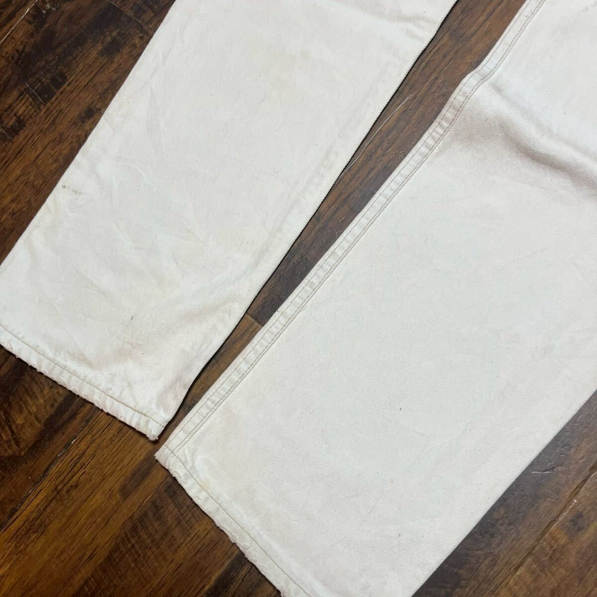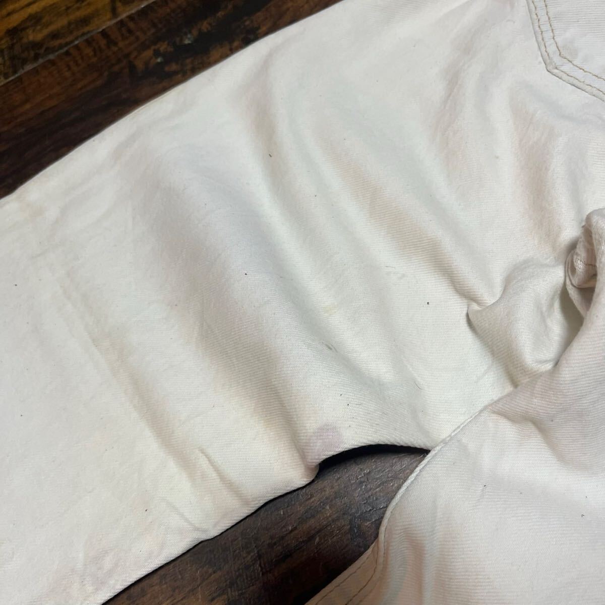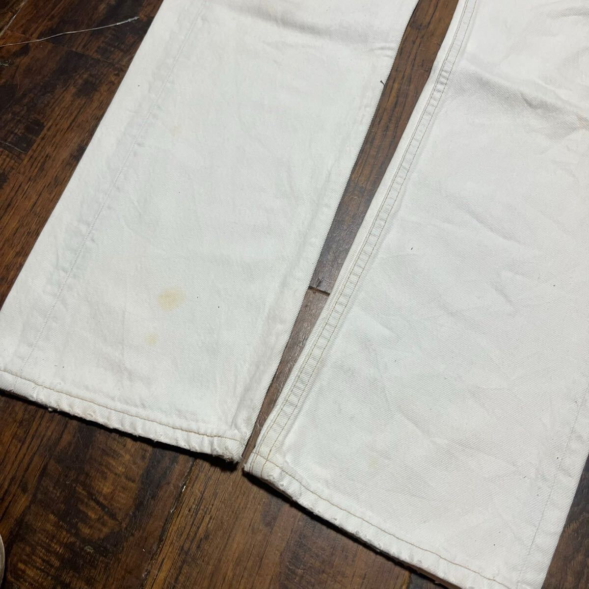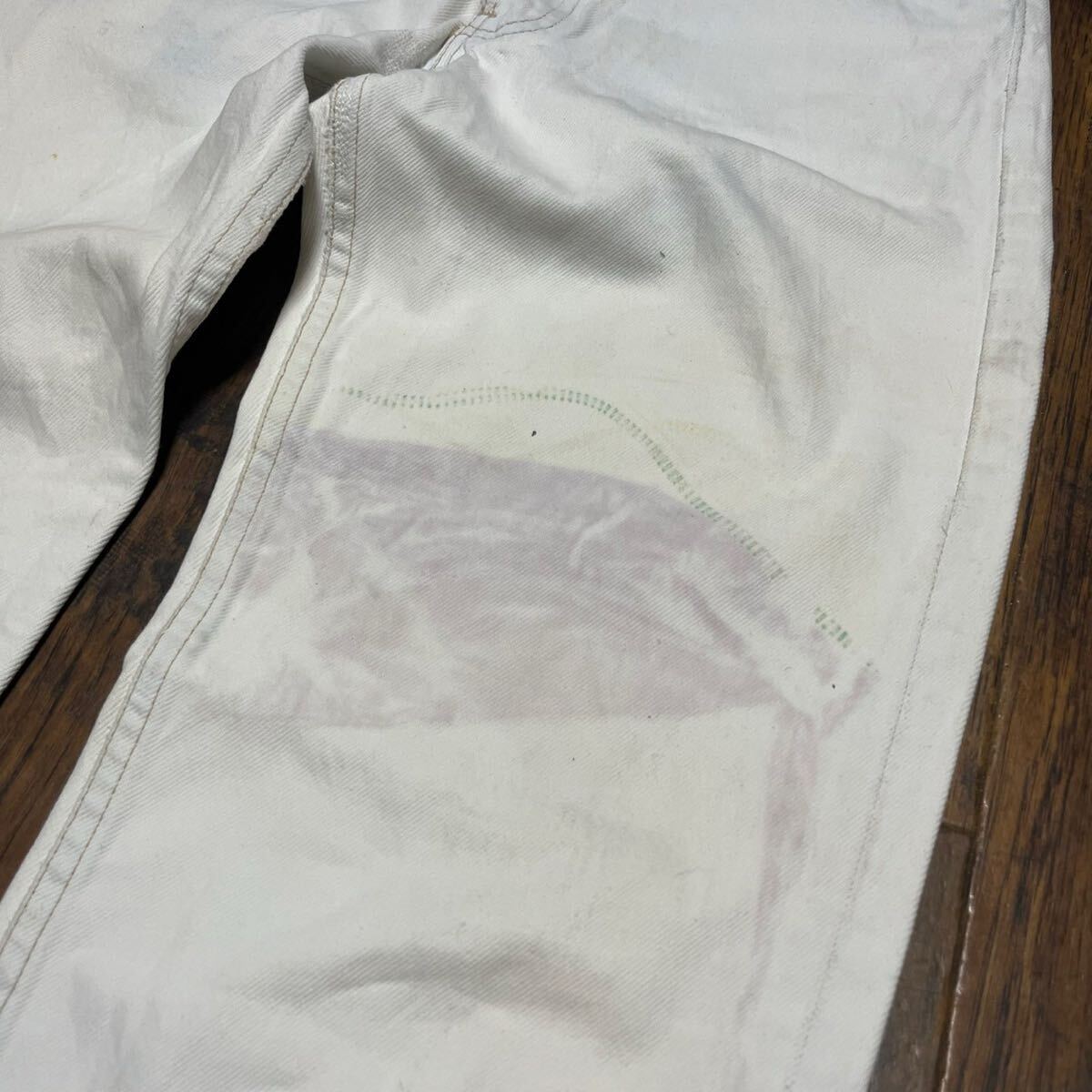 コンディション : 左腿、右脛辺りに目立つシミ汚れがございます。所々に少し汚れがございますが、着用に問題あるダメージはございません。