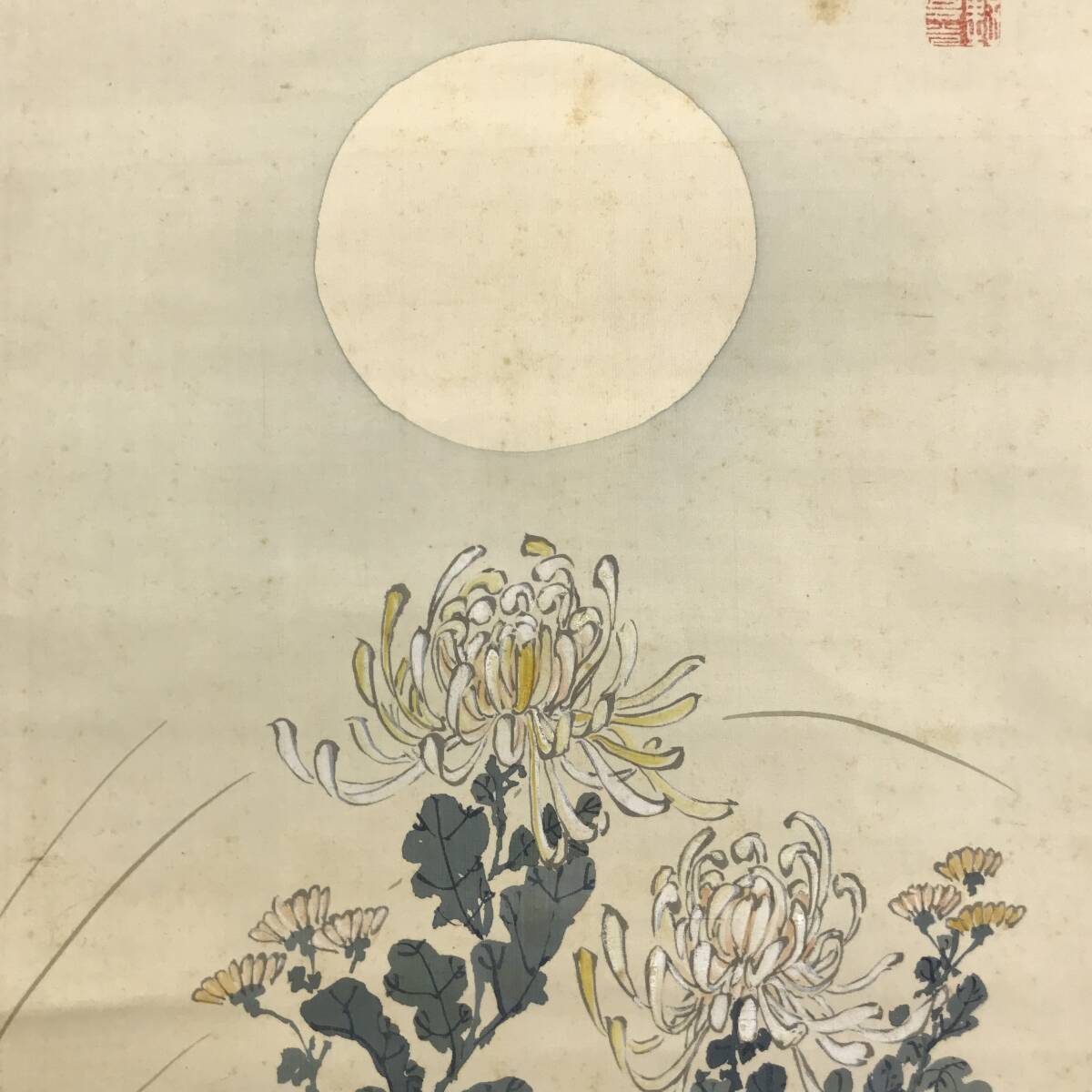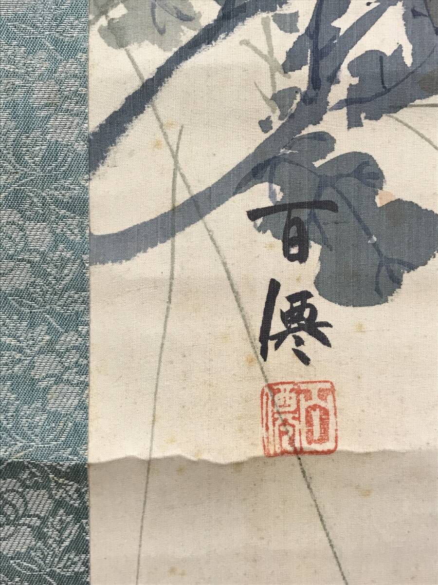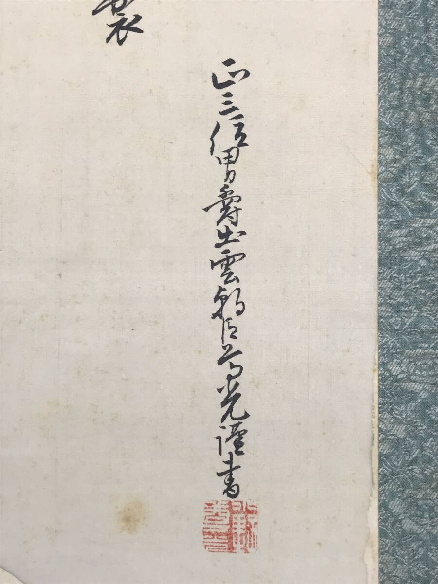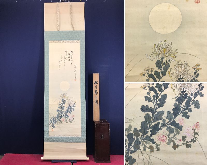 【作品状態】 本紙は絹本肉筆です。本紙は薄汚れ、全体に多数の糊シミ、折れ、巻シワあります。表装は天地に薄汚れ、多少の汚れシミあります。箱に多少の欠損あります。