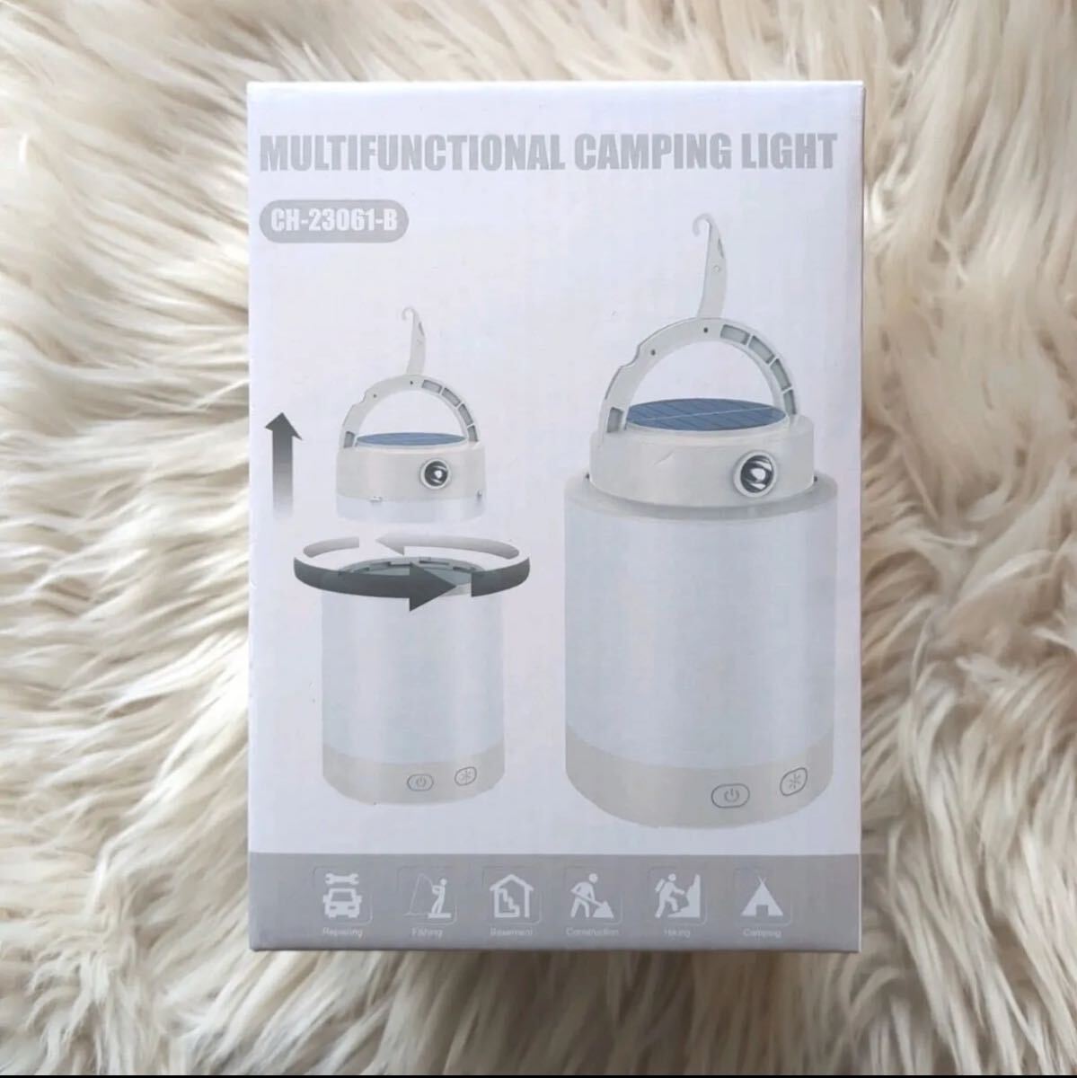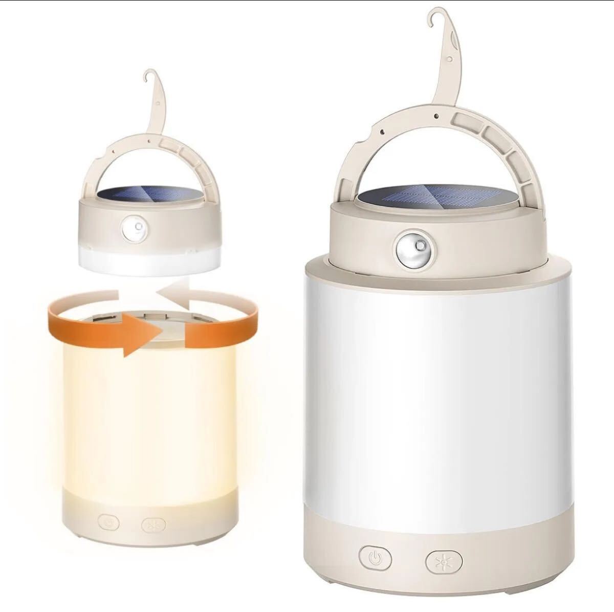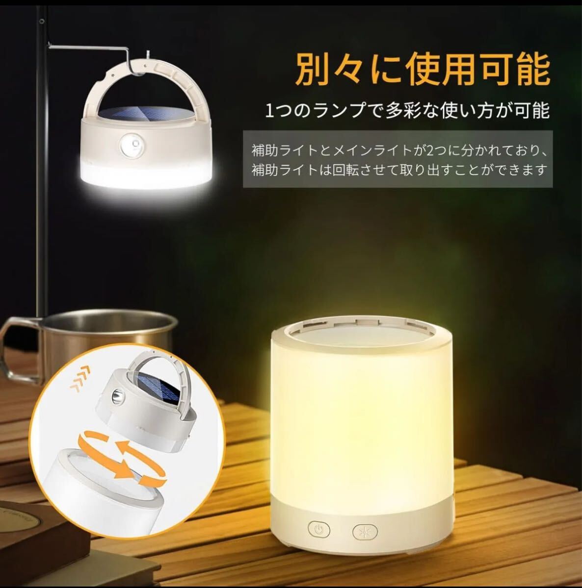 メインライトとソーラーランタンの補助ライトがそれぞれ独立して使用できるだけでなく、上下に組み合わせることも可能です。キャンプの際メインライトを天幕の中心に吊り下げることで、広い空間を明るく照らすことができます。ライトをテーブルの上やベッドサイドに置けば、局所的な照明として利用できます。