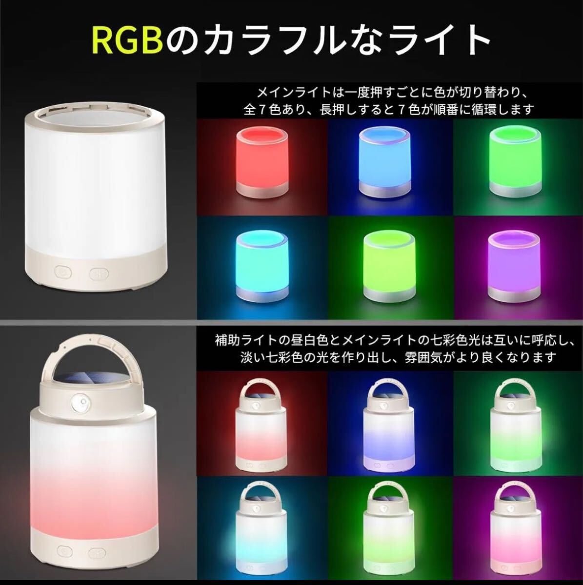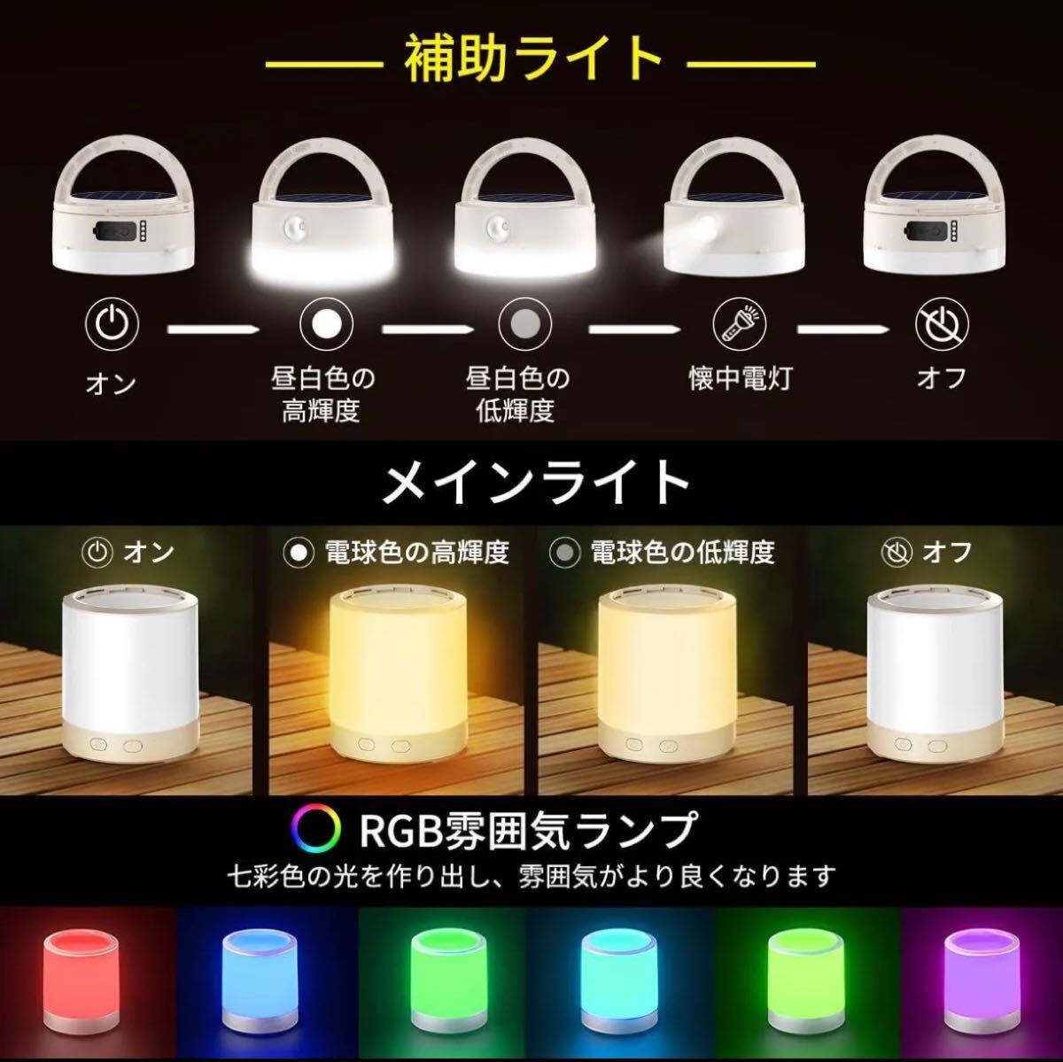 IPX5防水仕様で軽い雨や水しぶきに強く、キャンプや屋外での使用に最適です。補助ライトには4種類の照明モードが用意されており、使用状況に応じてモードを選択することができます。メインライトには黄光ハイブライト、黄光低輝度、7色のカラーライトモードがあります。メインライトと補助ライトを上下に組み合わせると淡いカラーライトが広がり、雰囲気を演出することができます。