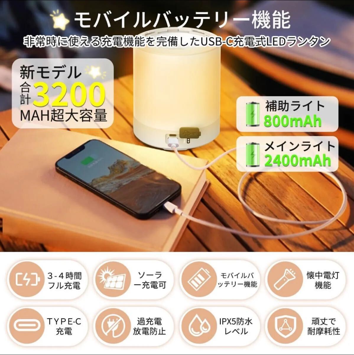 メインライトは 2400mAh、補助ライトは 800mAhの電池容量を持ち長時間の使用が可能です。特にメインライトにはモバイルバッテリー機能が搭載されており、スマートフォンや他のUSB機器の電池が切れそうになったとき充電することができます。