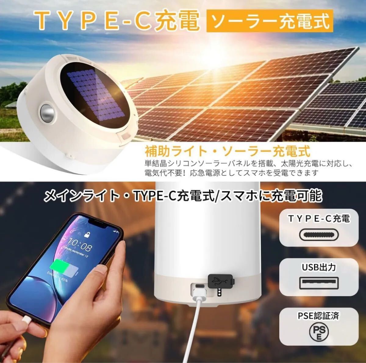 補助ライトには太陽光充電が可能な太陽電池パネルが搭載されています。キャンプやアウトドアの際、太陽光を利用して充電することができます。メインライトと補助ライトの両方が USB-C充電に対応しており、スマートフォンやUSB機器と同じ充電ケーブルを使用できます。外出先でも簡単に充電可能で、安心して使用することができます。