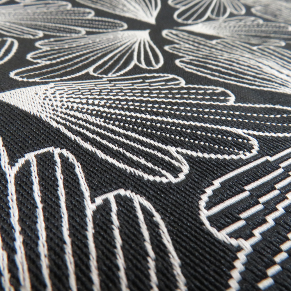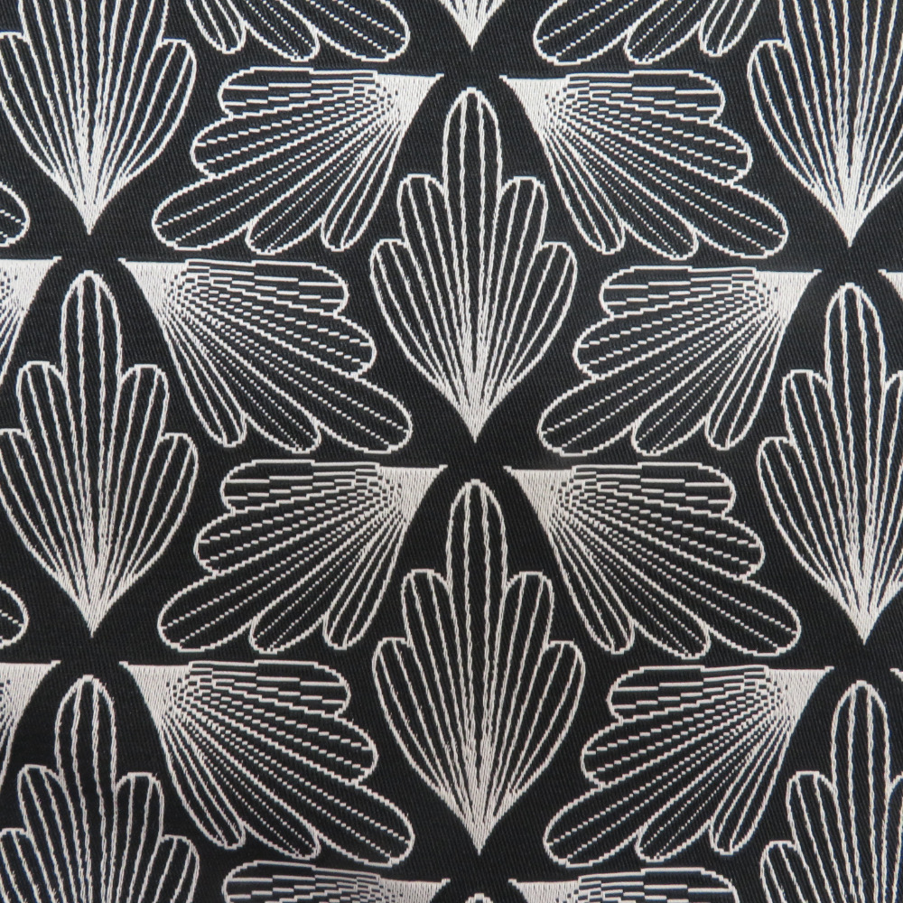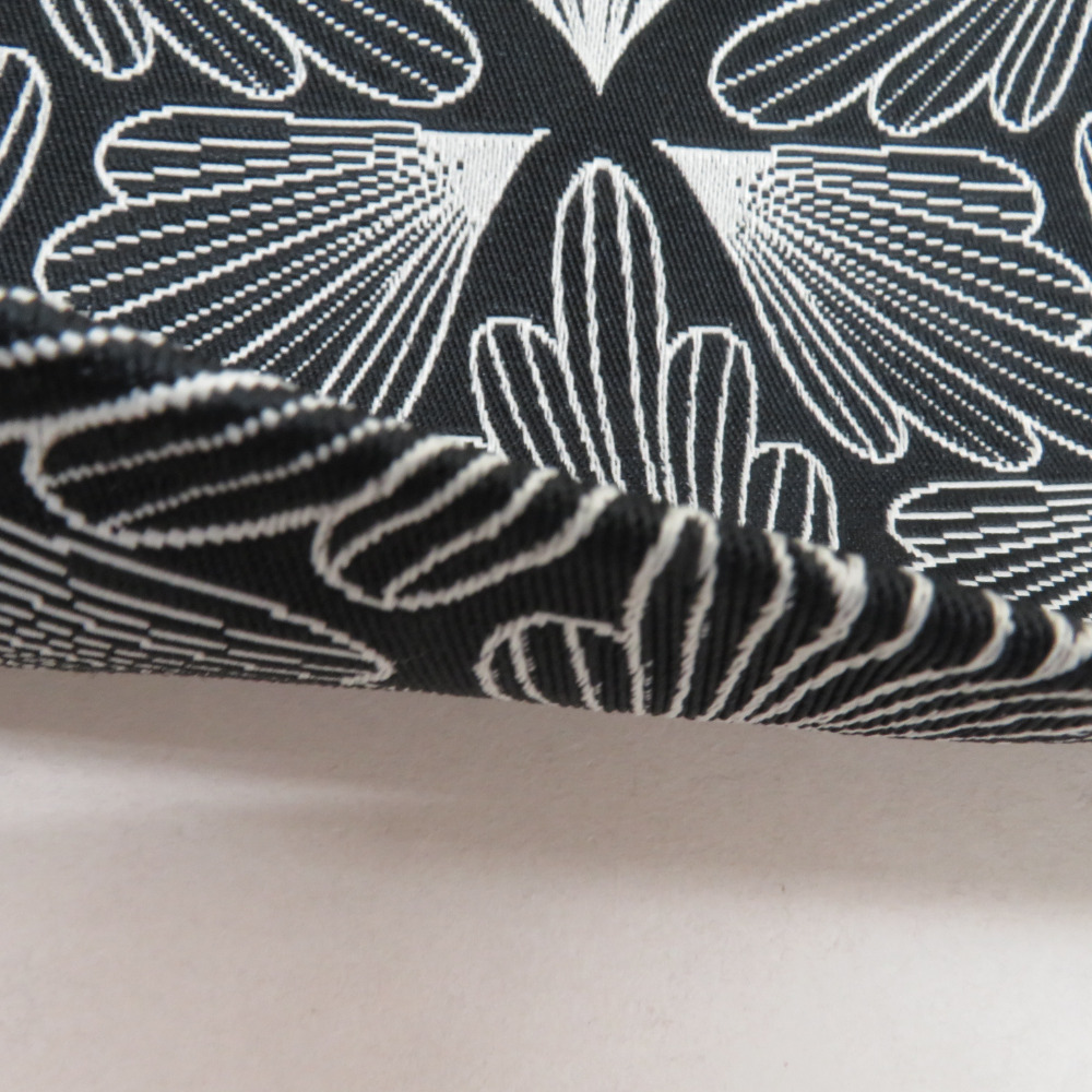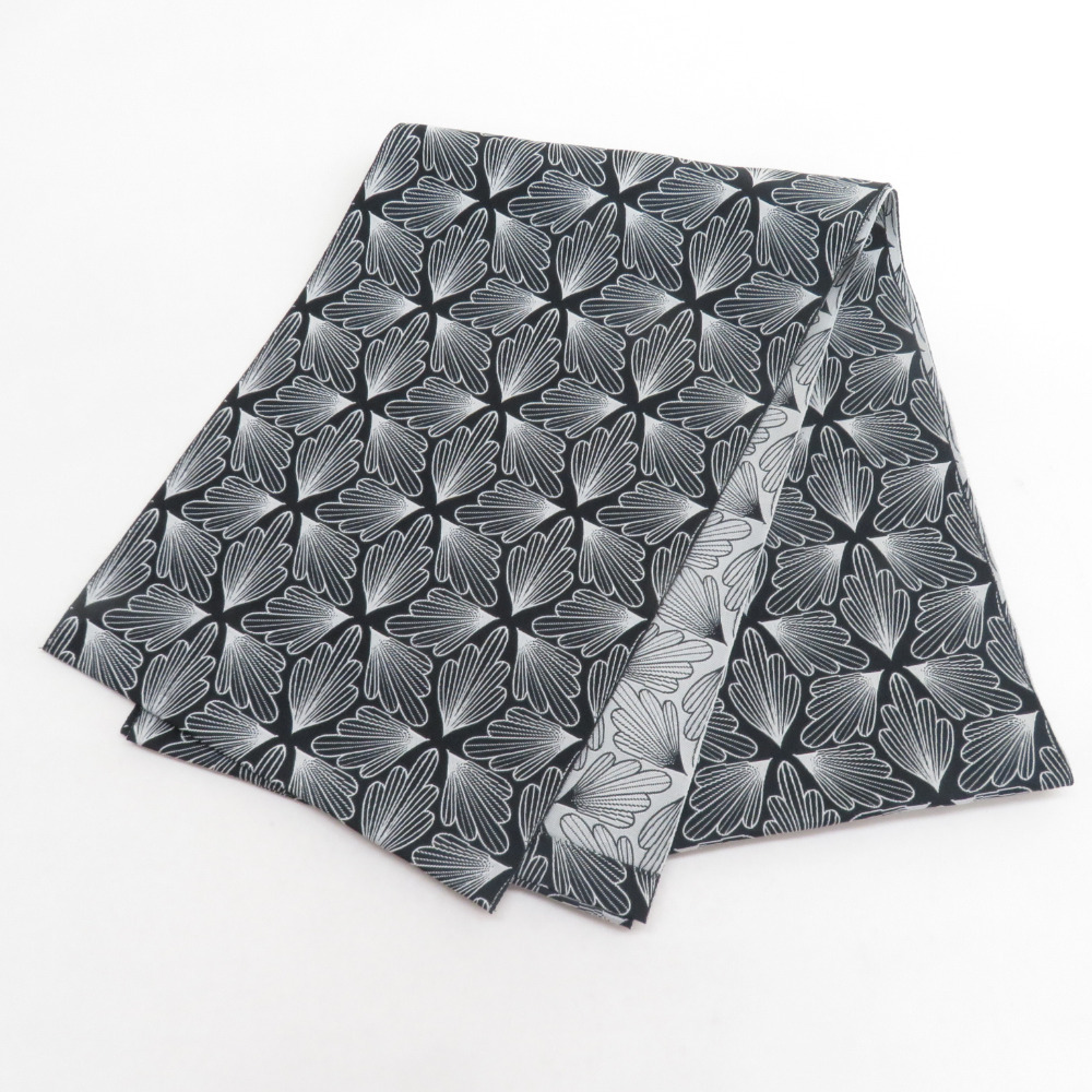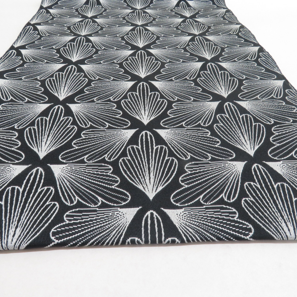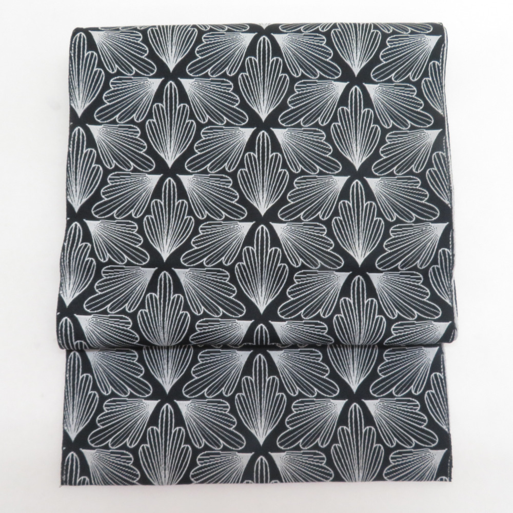 | 名古屋帯 ポリエステル 開き仕立て 黒色x灰色 全通柄 向き合う葉っぱ模様 カジュアル 仕立て上がり 着物帯 長さ368cm |