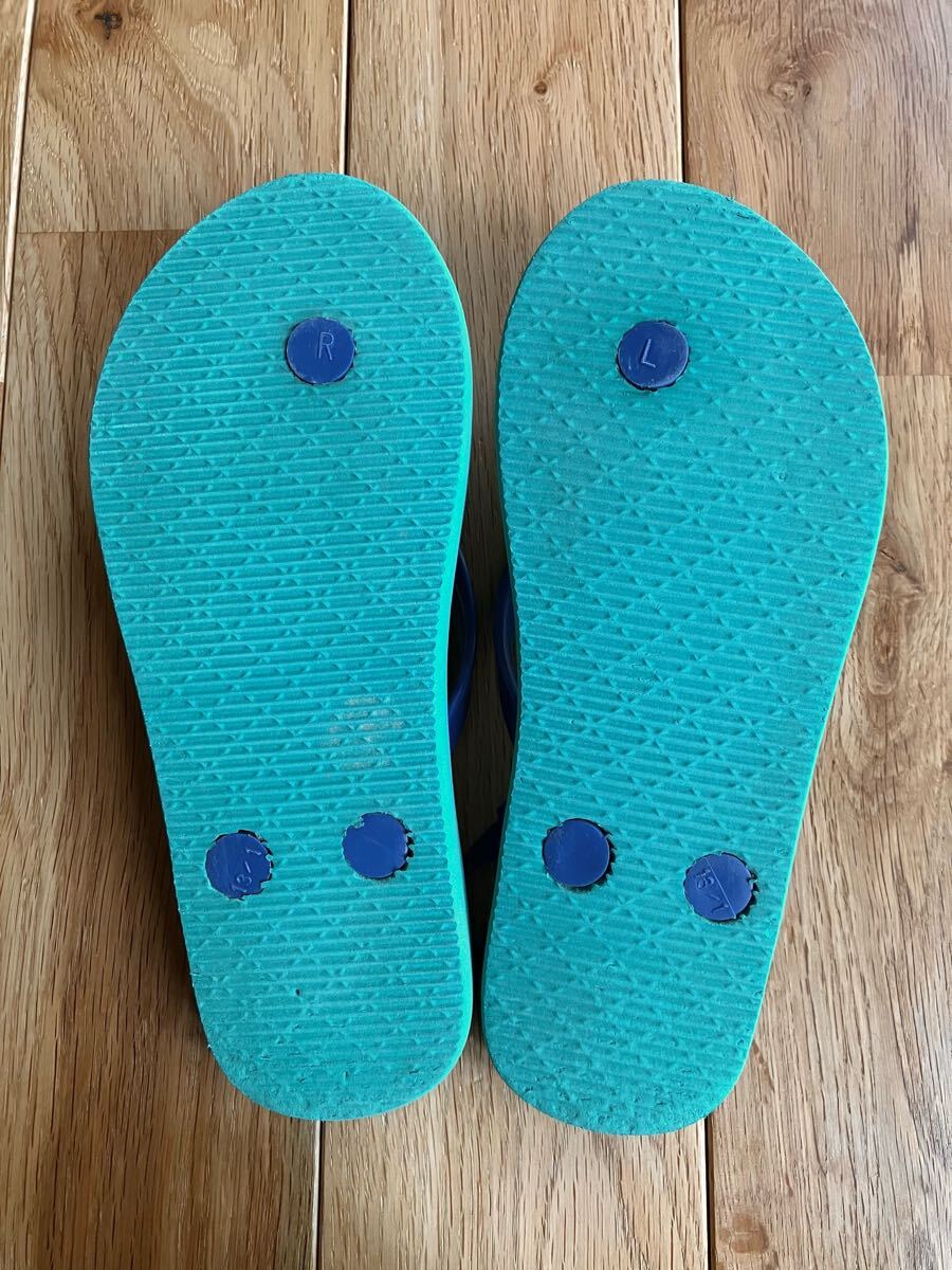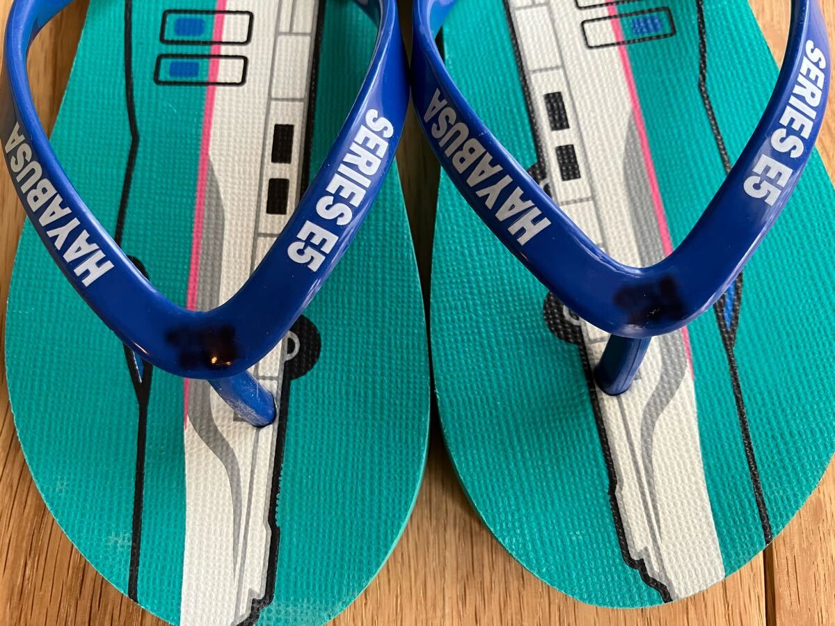 鼻緒の部分の真ん中に名前シールを貼っていて、剥がしたら鼻緒の素材にまでペンの色が浸透してしまったようで、そこだけペンのにじみがあります。
