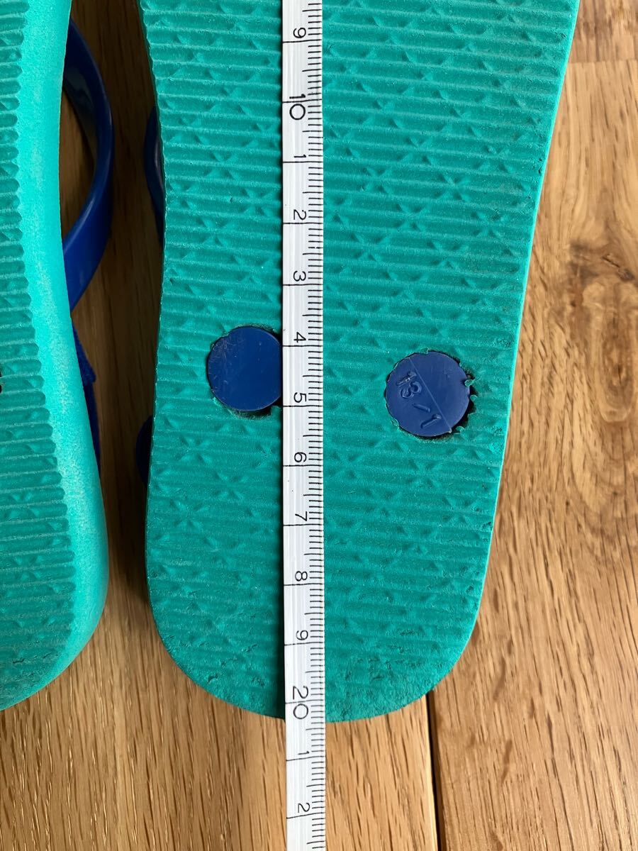 裏のサイズが大体20センチちょっとくらいなので18〜19センチくらいのサイズ感かと思いますが、お手持ちのサンダルと比較をお願いします。