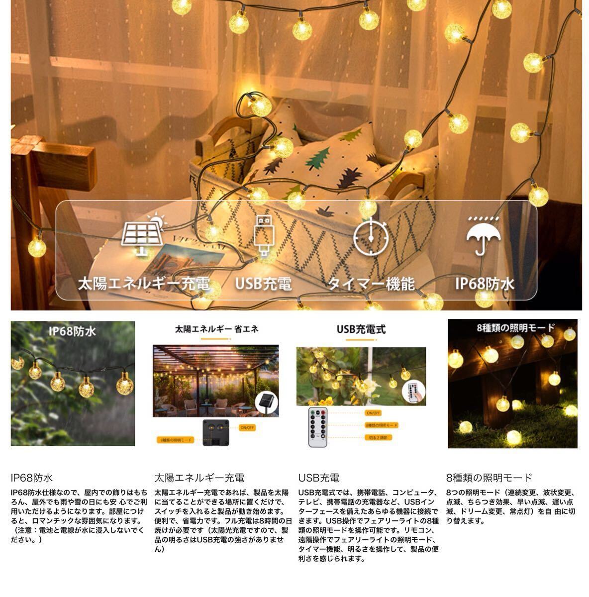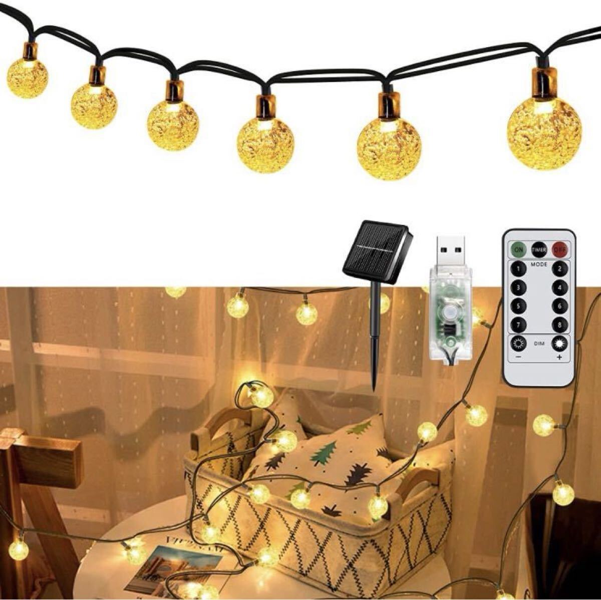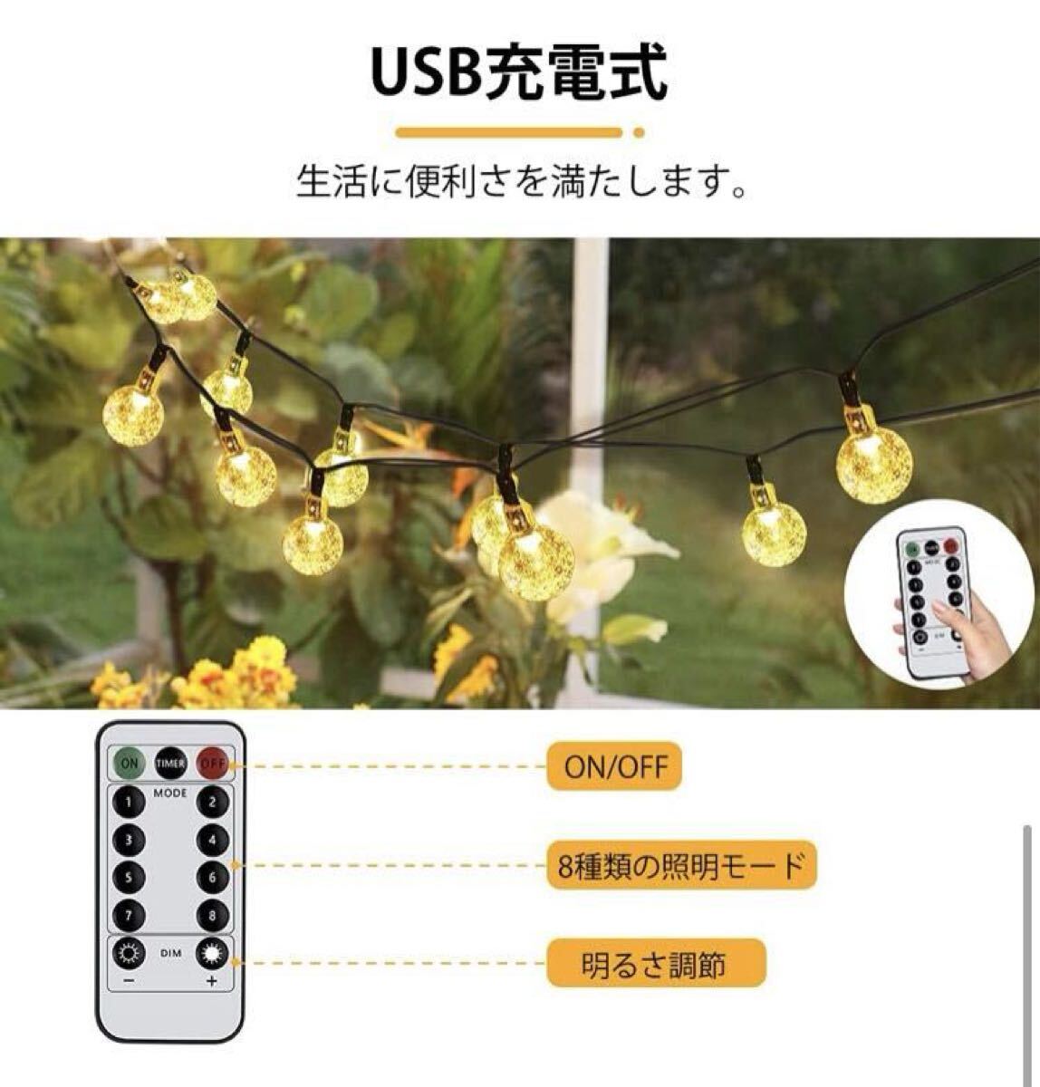 USB充電&ソーラー充電:製品はUSB充電とソーラー充電の2つ方式が共存しています。ソーラー充電であれば、製品を太陽に当てることができる場所に置くだけで、スイッチを入れると製品が動き始めます。便利で、省電力です。フル充電は8時間の日焼けが必要です(太陽光充電ですので、製品の明るさはUSB充電の強さがありません)そして、USB充電式では、携帯電話、コンピュータ、テレビ、携帯電話の充電器など、USBインターフェースを備えたあらゆる機器に接続できます。USB操作でフェアリーライトの8種類の照明モードを操作可能です。リモコン、遠隔操作でフェアリーライトの照明モード、タイマー機能、明るさを操作して、製品の便利さを感じられます。