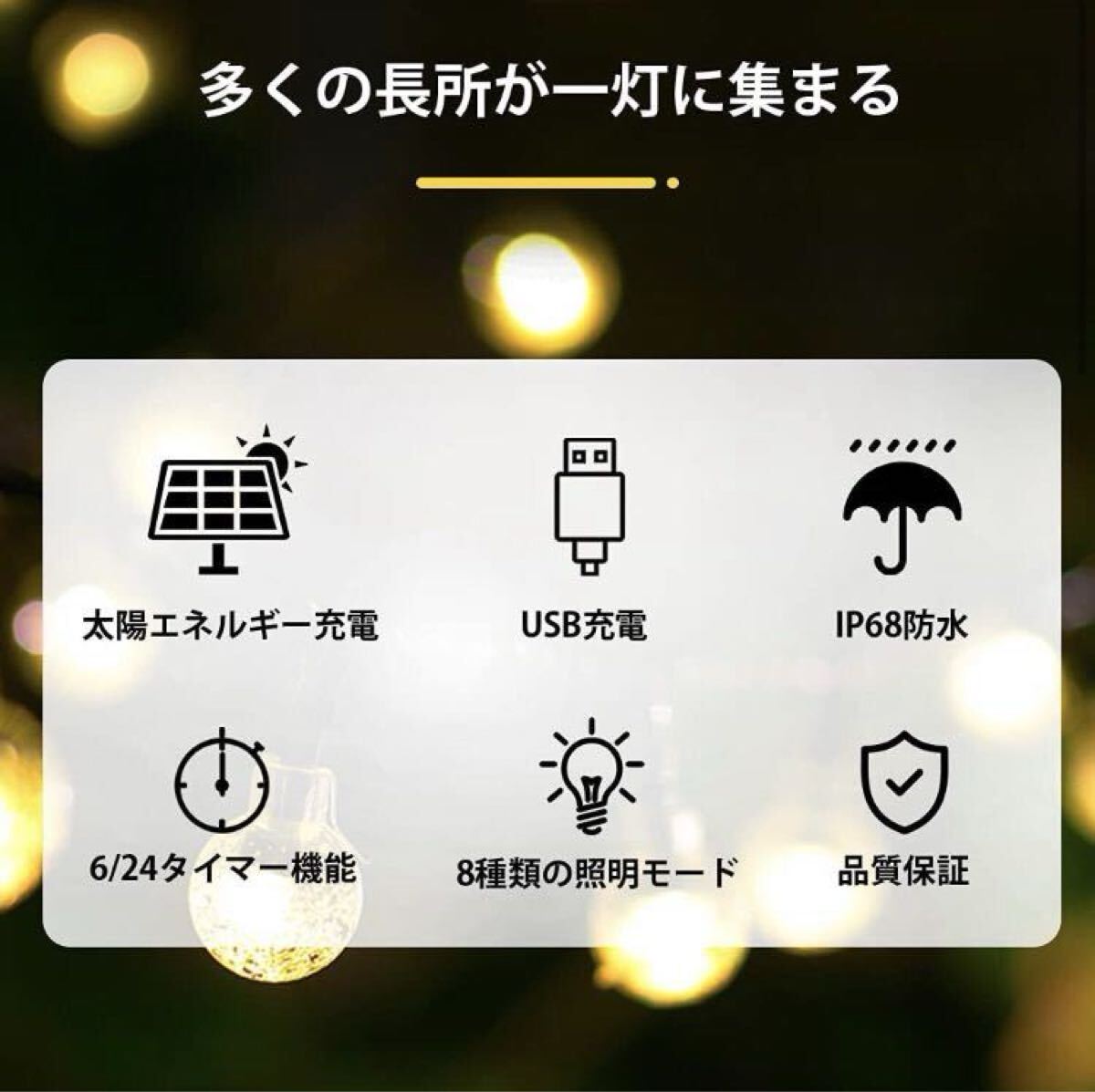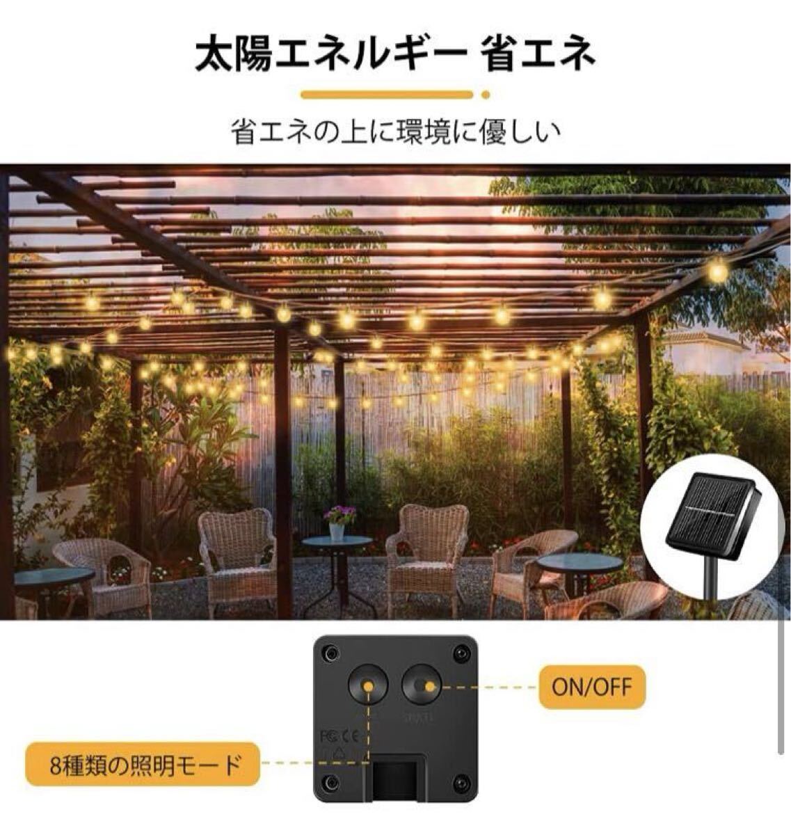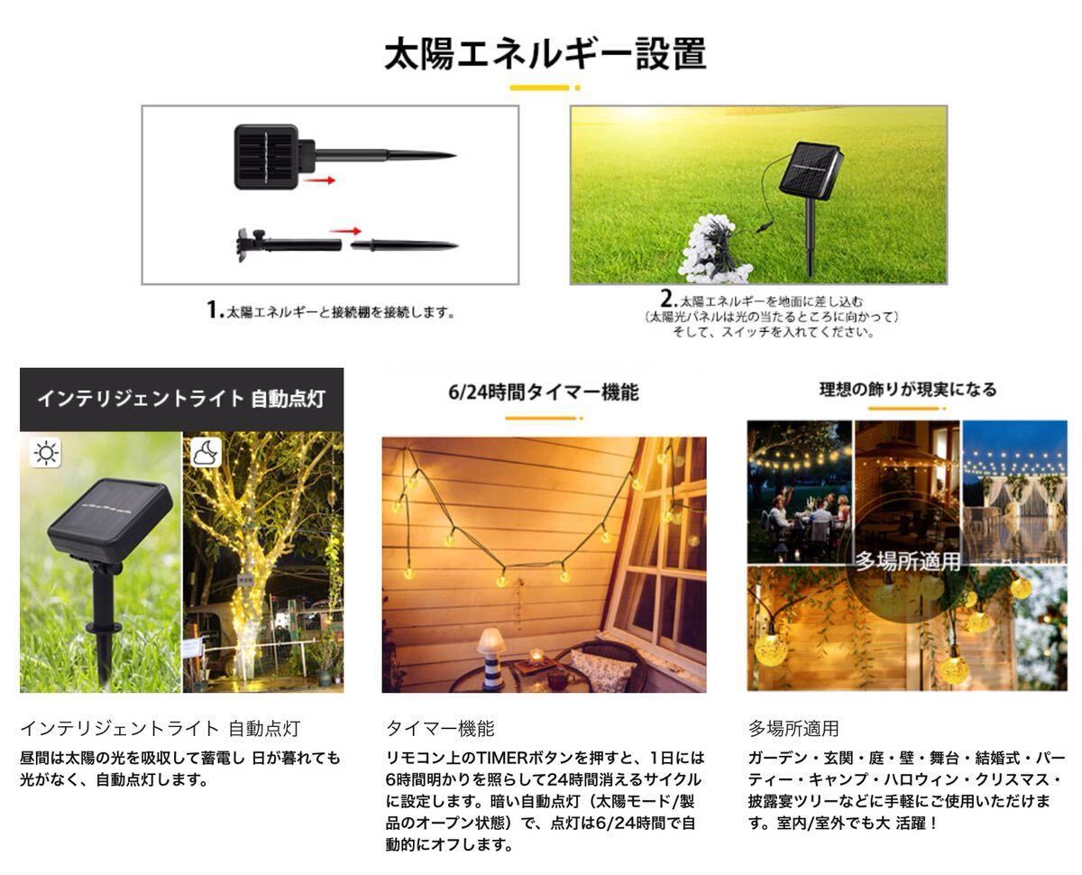 USB充電&ソーラー充電:製品はUSB充電とソーラー充電の2つ方式が共存しています。ソーラー充電であれば、製品を太陽に当てることができる場所に置くだけで、スイッチを入れると製品が動き始めます。便利で、省電力です。フル充電は8時間の日焼けが必要です(太陽光充電ですので、製品の明るさはUSB充電の強さがありません)そして、USB充電式では、携帯電話、コンピュータ、テレビ、携帯電話の充電器など、USBインターフェースを備えたあらゆる機器に接続できます。USB操作でフェアリーライトの8種類の照明モードを操作可能です。リモコン、遠隔操作でフェアリーライトの照明モード、タイマー機能、明るさを操作して、製品の便利さを感じられます。
