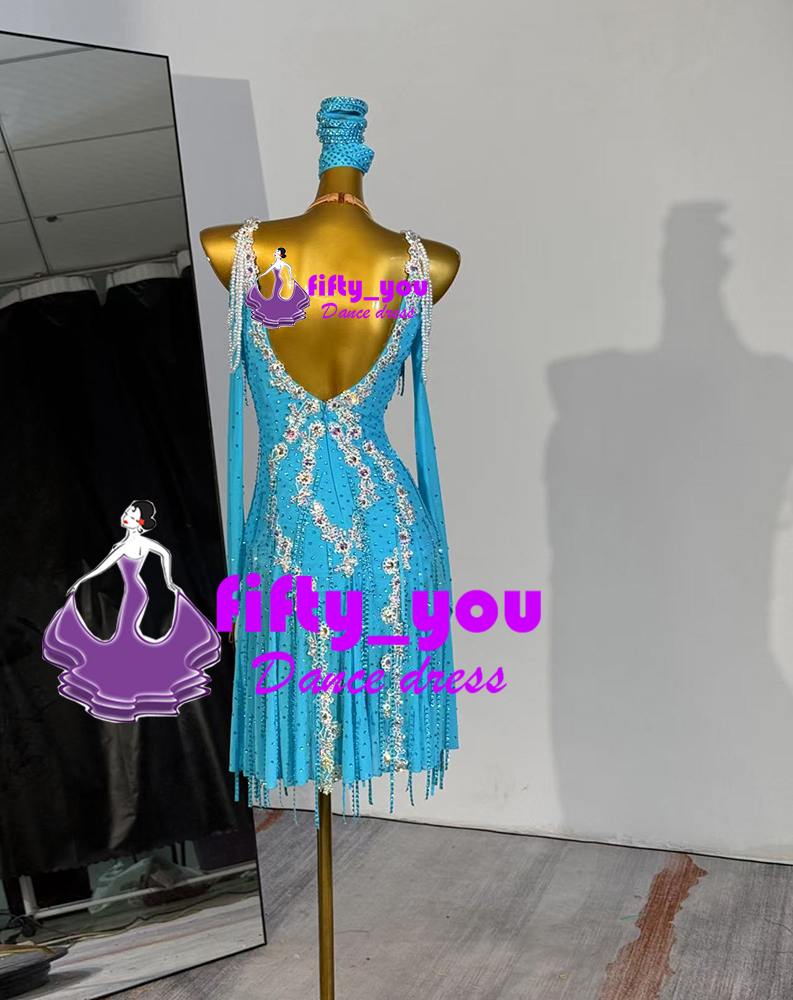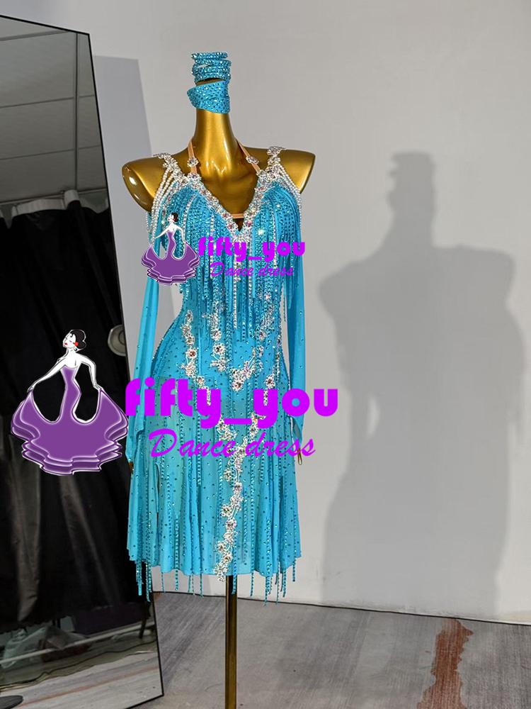 新品fifty_you レディース社交ダンス衣装  ラテン競技デモ用ドレス セミオーダー ストーンビーズいっぱい飾り パール付き 水色