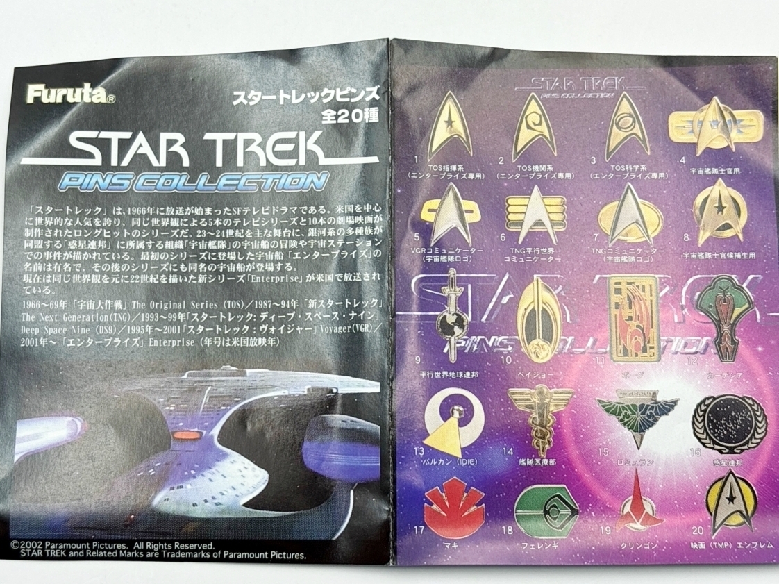 「スタートレックシリーズ」に登場する宇宙艦隊の記章や、クリンゴンやロミュラン、ボーグ等のシンボルマークなどをピンバッジにしたものです。特製ディスプレイスタンドがついています。