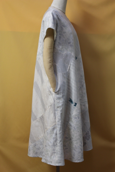 kiraraemiry着物リメイク・②ブルー系紬コンビ・フレンチスリーブ・ワンピース・ドレープドレス・右脇シームポケット・M寸