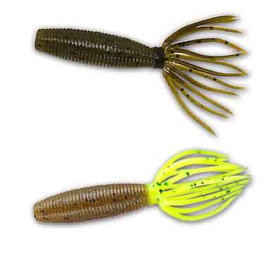 従来のフラスカートが24本からなるのに対し、フィネススカートは半数の12本です。軽量リグとの組み合わせにおいてもレスポンスの良いフレアーアクションを生み出すフィネススカートは、ベビーファットイカとのコンビネーションにおいてもその性能を如何なく発揮。 ノーシンカーリグにおいてもゴワつくことなく大きなフレアーアクションでバスにアピールします。
