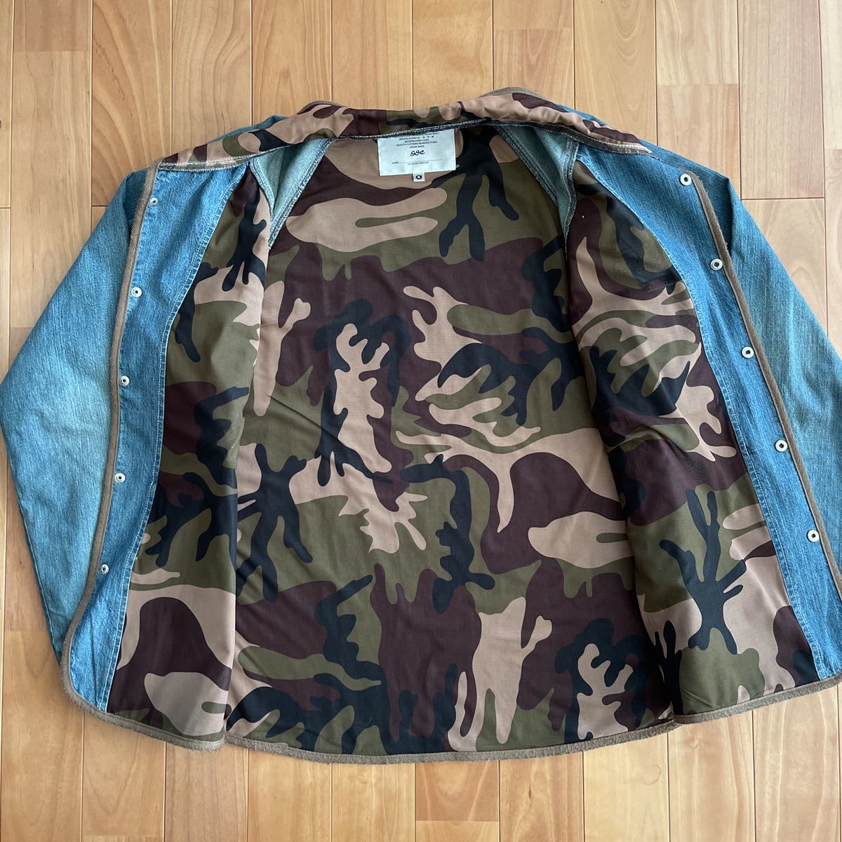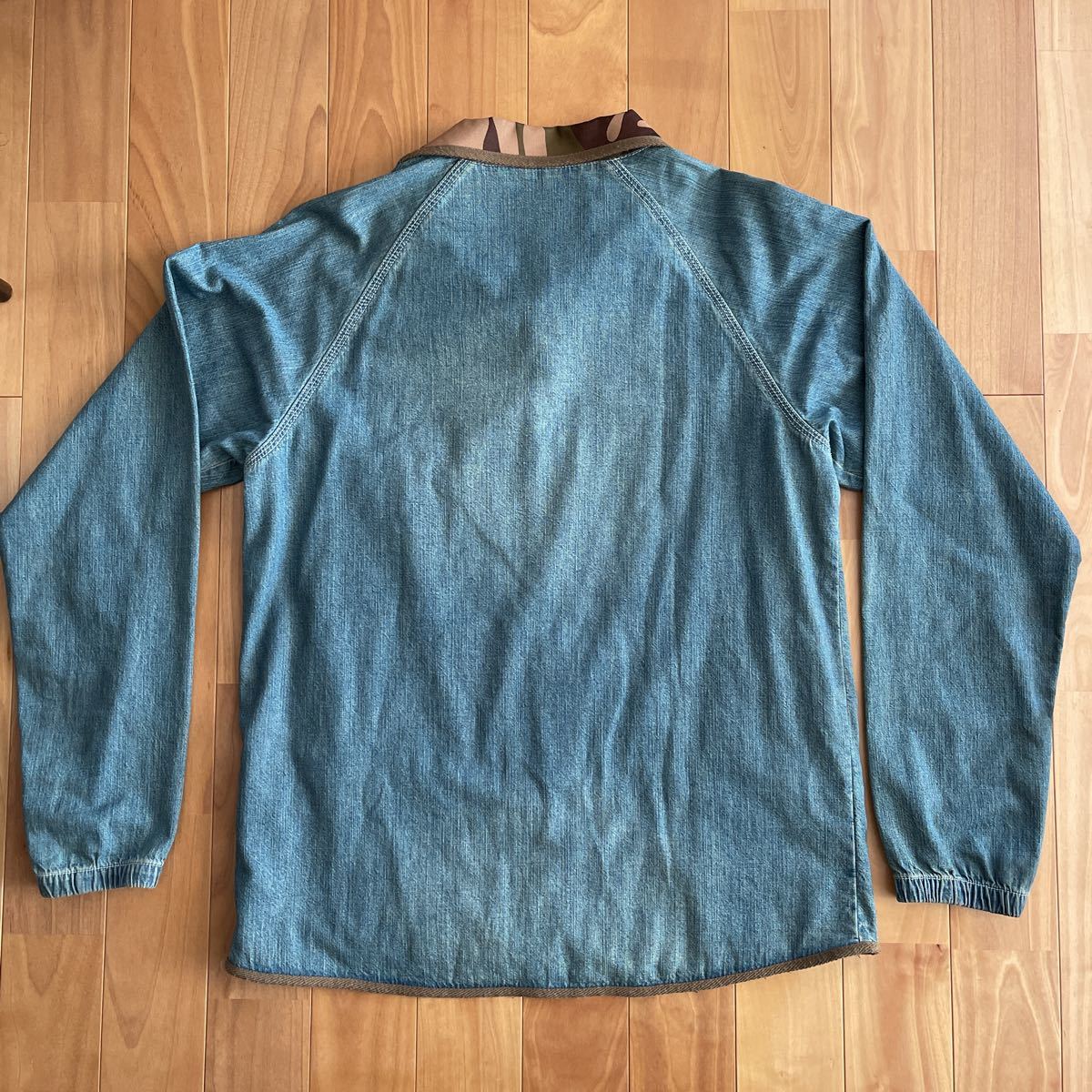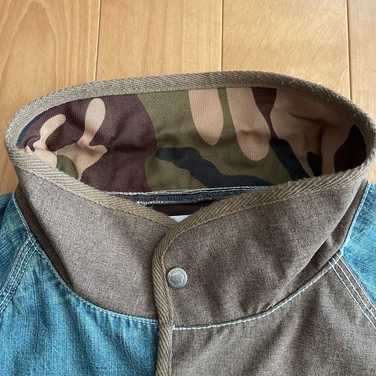 結構使用しましたので、かなり使用感あります。色ももう少し濃かったと思いますので、色落ちしています。全体的にうっすら汚れていますが、左右の袖の裏側、肘のあたりが特に汚れています。 表地がコットン100%になります。柔らかくて薄い生地ですので、秋口に最適かと思います。フロントはボタンになっています。胸元のポケットもボタンです。両サイドのポケットはジップになっていますので閉じることも可能です。裏地が迷彩になっていますので、ボタンを留めなければ、ちらっと見せることができます。表地の淵や胸元のあたりはこげ茶色になっています。サイズの表記が4になっており、大体Lぐらいかなと思います。 実寸は、 着丈:71cm 身幅:56cm 袖丈(ラグランなので襟元から採寸しました):80.5cm 平置きにての素人採寸ですので、多少の誤差はご了承ください。以上、よろしくお願いいたします。