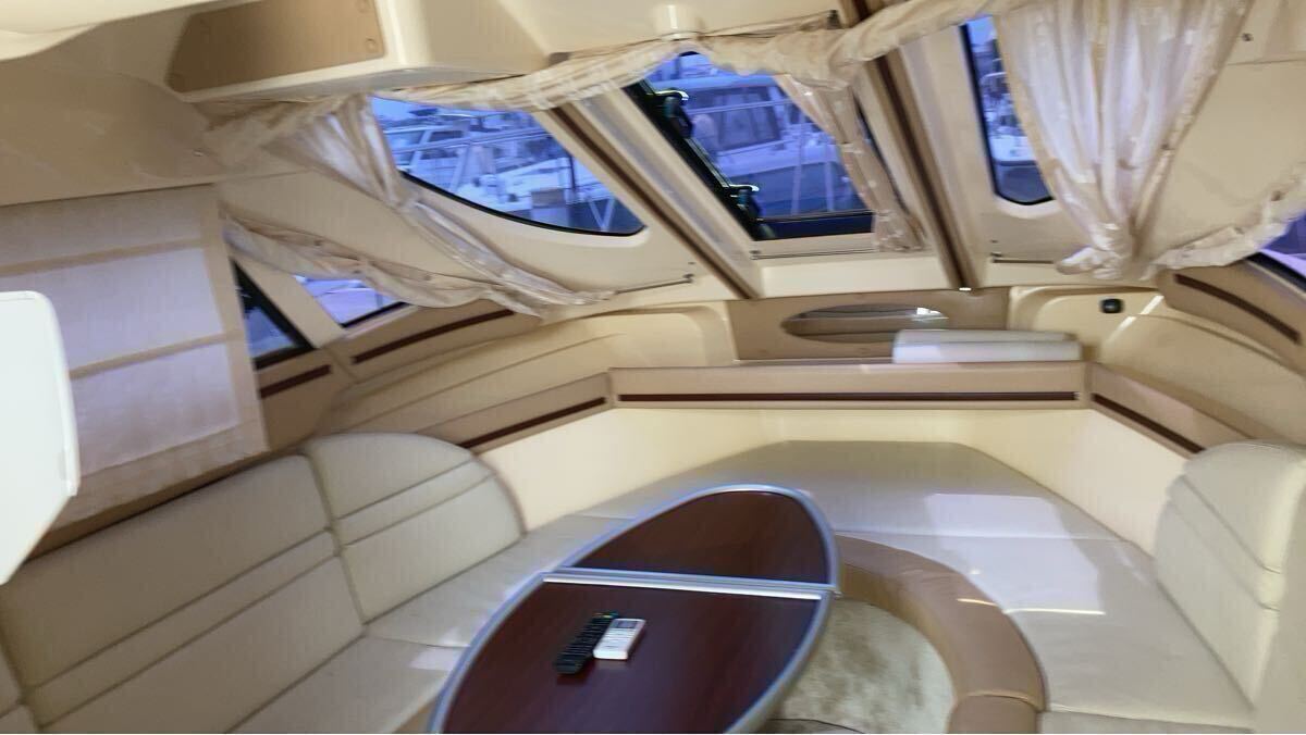 船内は広いワンルームになっており、食事や就寝が可能です。大人約6人ほど座れます。テーブルを下げてクッションを移動すればフルフラットなバースになり船内泊も可能です。発電機レスでポータブル電源を使用しています。(2000w)陸電及び走行充電可能です。