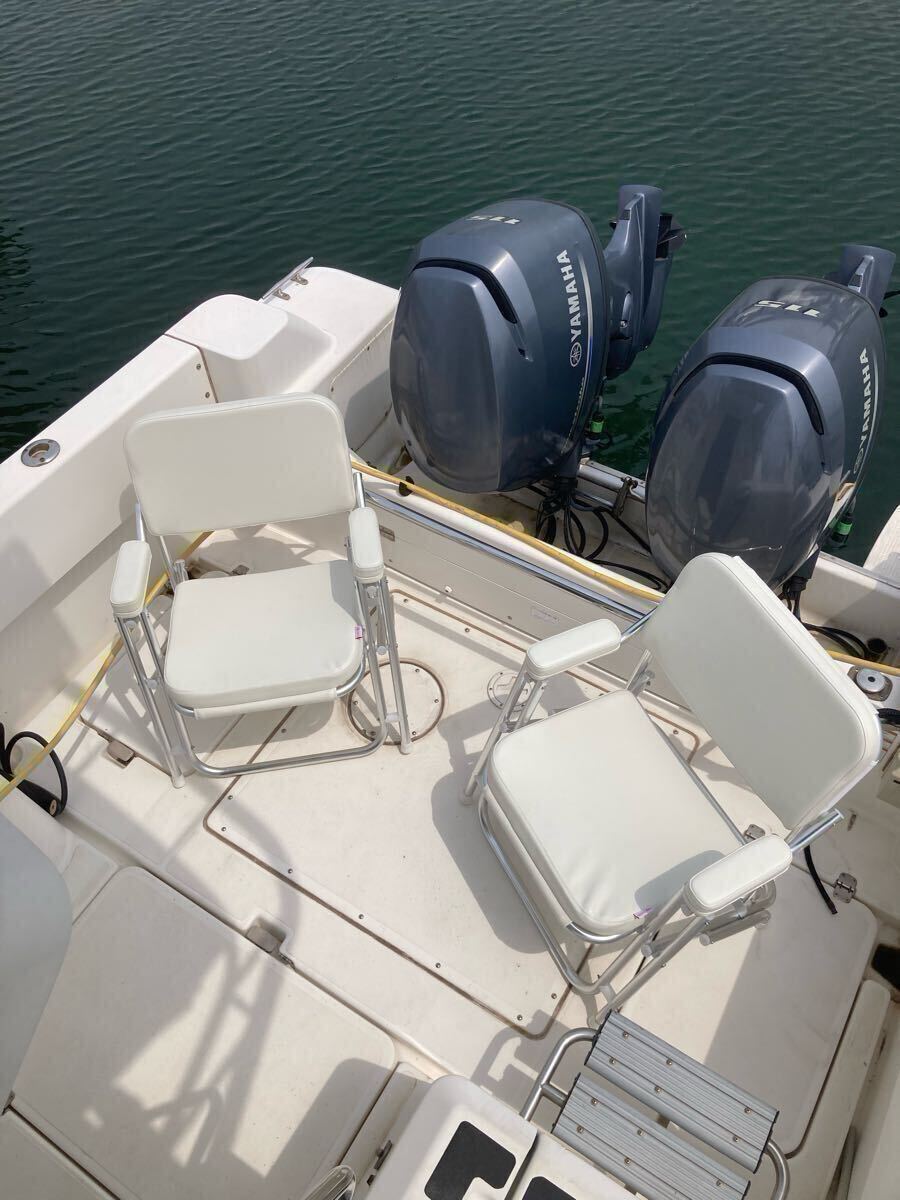 アフトデッキはキャビンドア左に大型物入れがあります。後置きのシートが2脚あります。