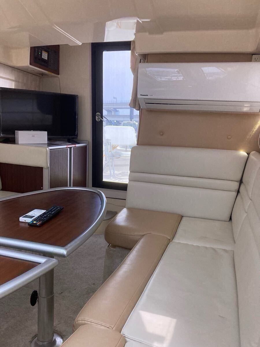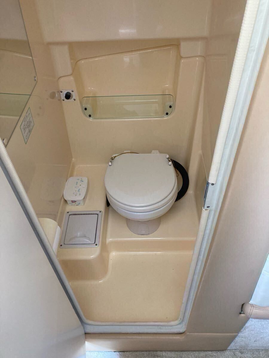 家庭用エアコン、テレビも通常使用可能です。夏場も窓ガラス全てにUVカットスモークフィルムを貼っていますので、エアコンを使用すれば快適です。トイレはキャビン入口の左側にあります。