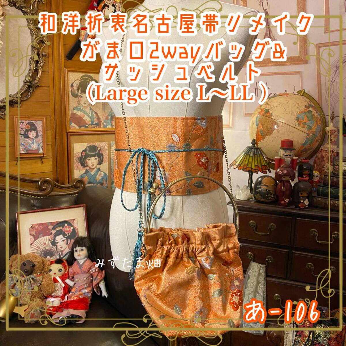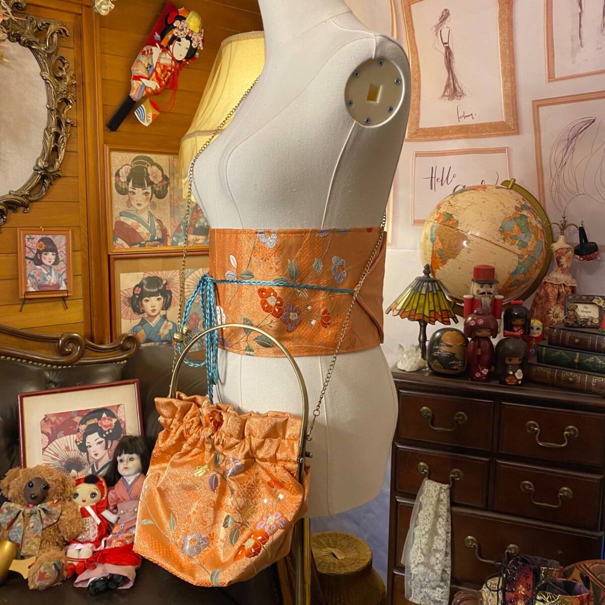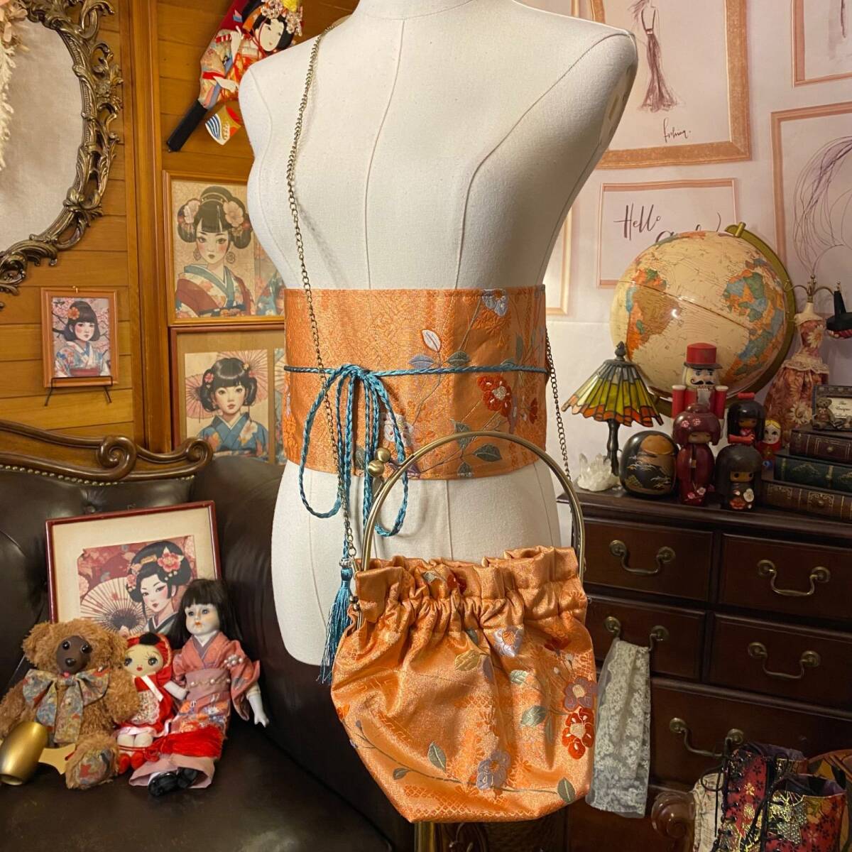 【和洋折衷 名古屋帯リメイク ハンドバッグ バック ショルダーチェーン付き ガマ口タイプ 帯サッシュベルト セット 陽ざしを抱き、掌でとろける。あ-106】