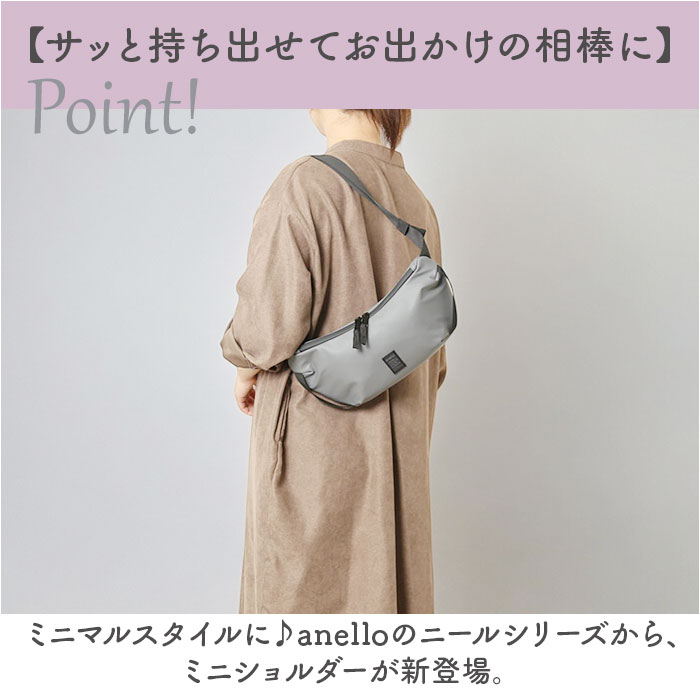 | 商品説明 | ・・【サッと持ち出せてお出かけの相棒に】 ・ミニマルスタイルに♪anelloのニールシリーズから、ミニショルダーが新登場。 ・【デザインも機能性もばっちり】 ・マットな生地に止水ファスナーを合わせ、シャープな印象に仕上げたシリーズ。 ・【アウトドアなど屋外シーンで重宝】 ・本体(メイン)には、耐水生地を採用。突然のにわか雨でも慌てず、お手入れも拭き取るだけ。 ・(※1)水を通しにくい生地を使用しておりますが、完全防水ではありません。 ・【両手が空いてストレスフリー】 ・長さ調節可能なショルダーベルトを使って、肩掛けや斜め掛け。アクティブに動く日も快適。 ・【開閉スムーズなダブルファスナー】 ・左右どちらからもオープン!出し入れしやすく、ファスナーを閉じればプライバシーも確保◎ ・【普段使いしやすい横長フォルム】 ・長財布OK!、スマホやハンカチ、エチケットアイテムなど、マストアイテムがひとまとめ。 ・(※2)500mlペットボトルも収納可能ですが、バッグのフォルムがやや崩れる可能性があります。 ・【サッと取り出せて迷子知らず】 ・内側と外側に3つのポケットを配置。バッグの中で小物を探す手間が不要。 ・【体に負担をかけない軽量設計】 ・軽やかな使い心地で、移動の多い日も安心。旅行やフェスなどでも。 ・【お気に入りを選べるカラー】 ・年代や性別問わず持ちやすい!落ち着きのあるカラーをラインナップ。 ・【ポケット仕様】 ・内側:オープンポケット×2 ・背面:マグネットポケット×1 |