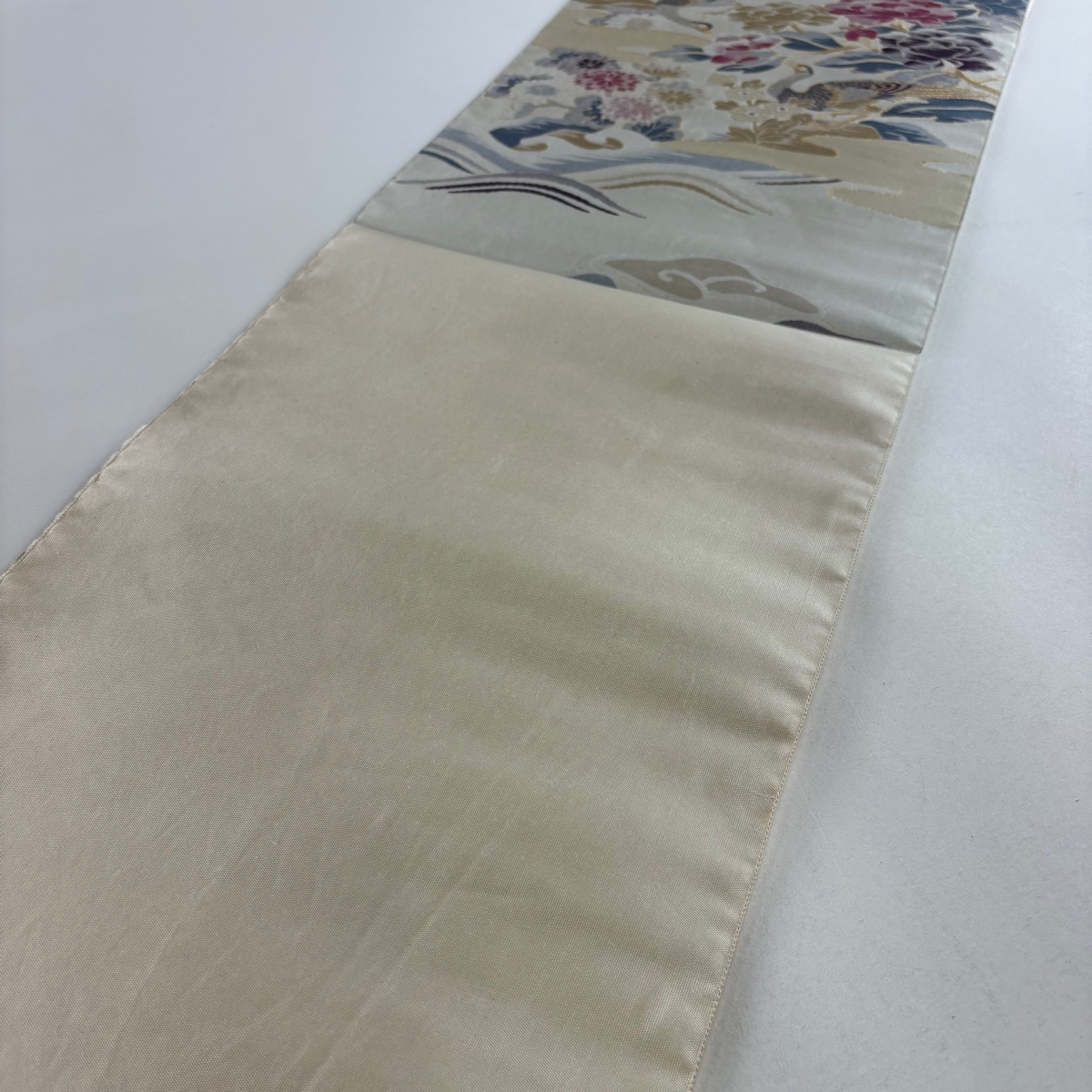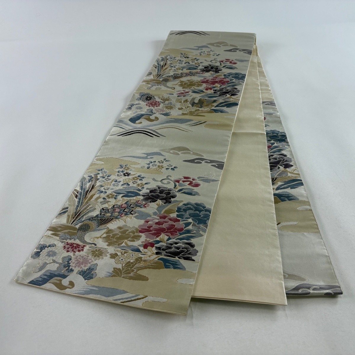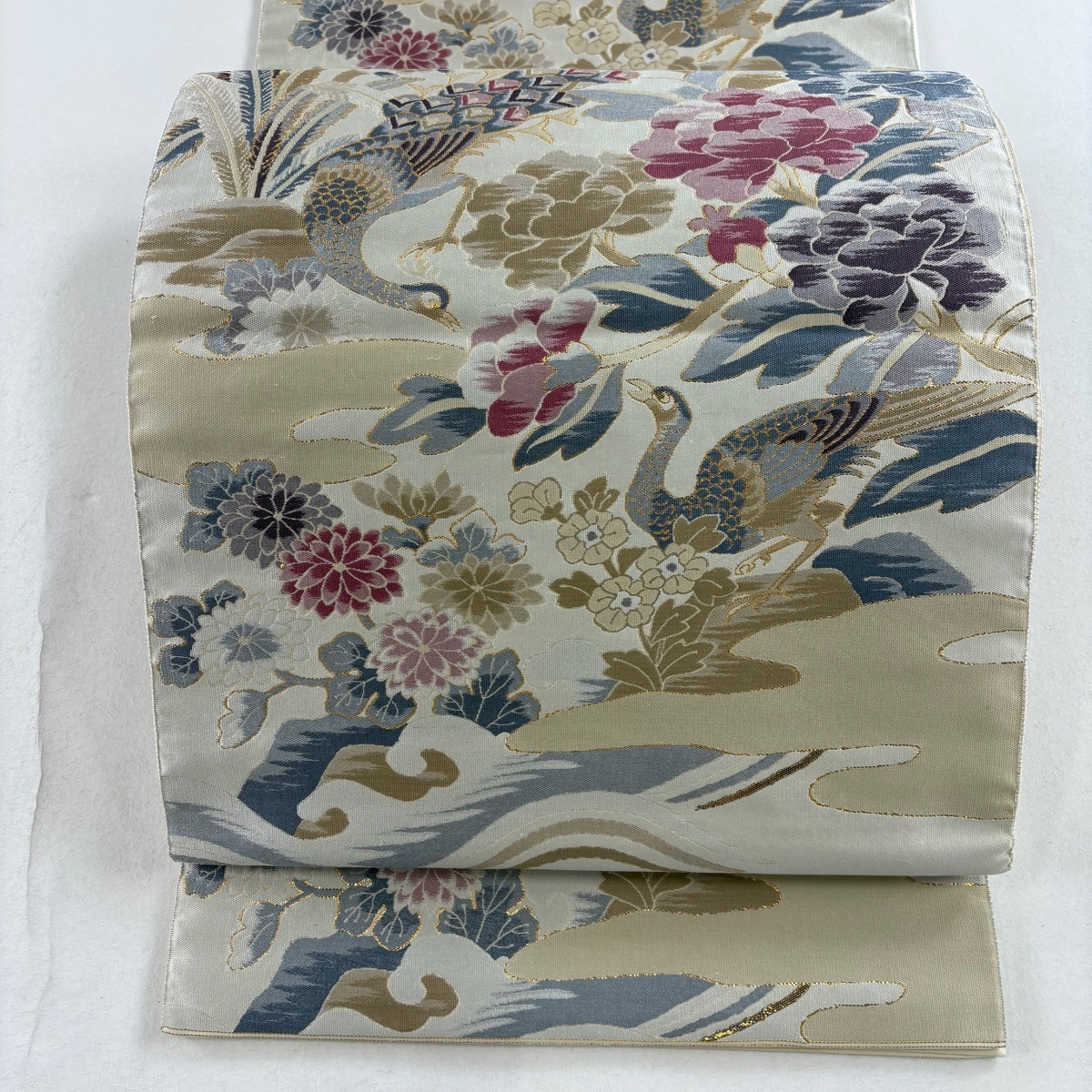 | 袋帯 秀品 関西仕立て 草花 孔雀 箔 クリーム 六通 正絹 【中古】 |