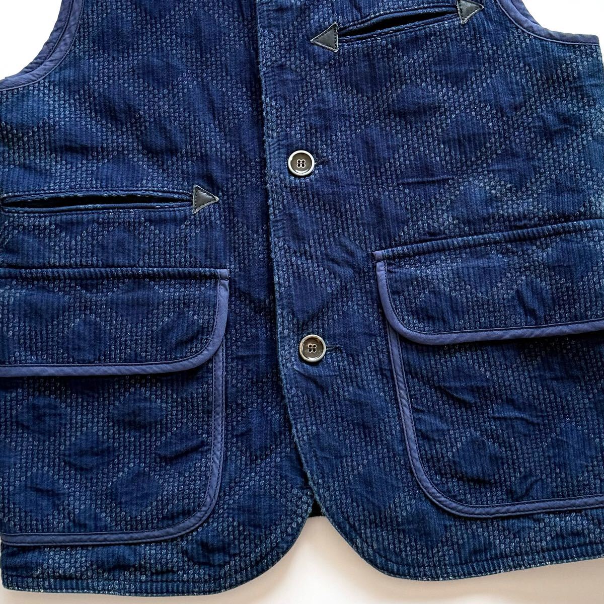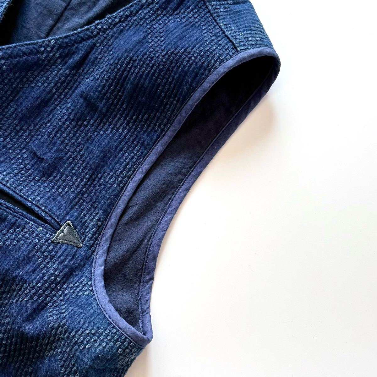 ポケット端には本藍染めによるホースハイドを使用しており大変雰囲気の良いベストに仕上がっております。