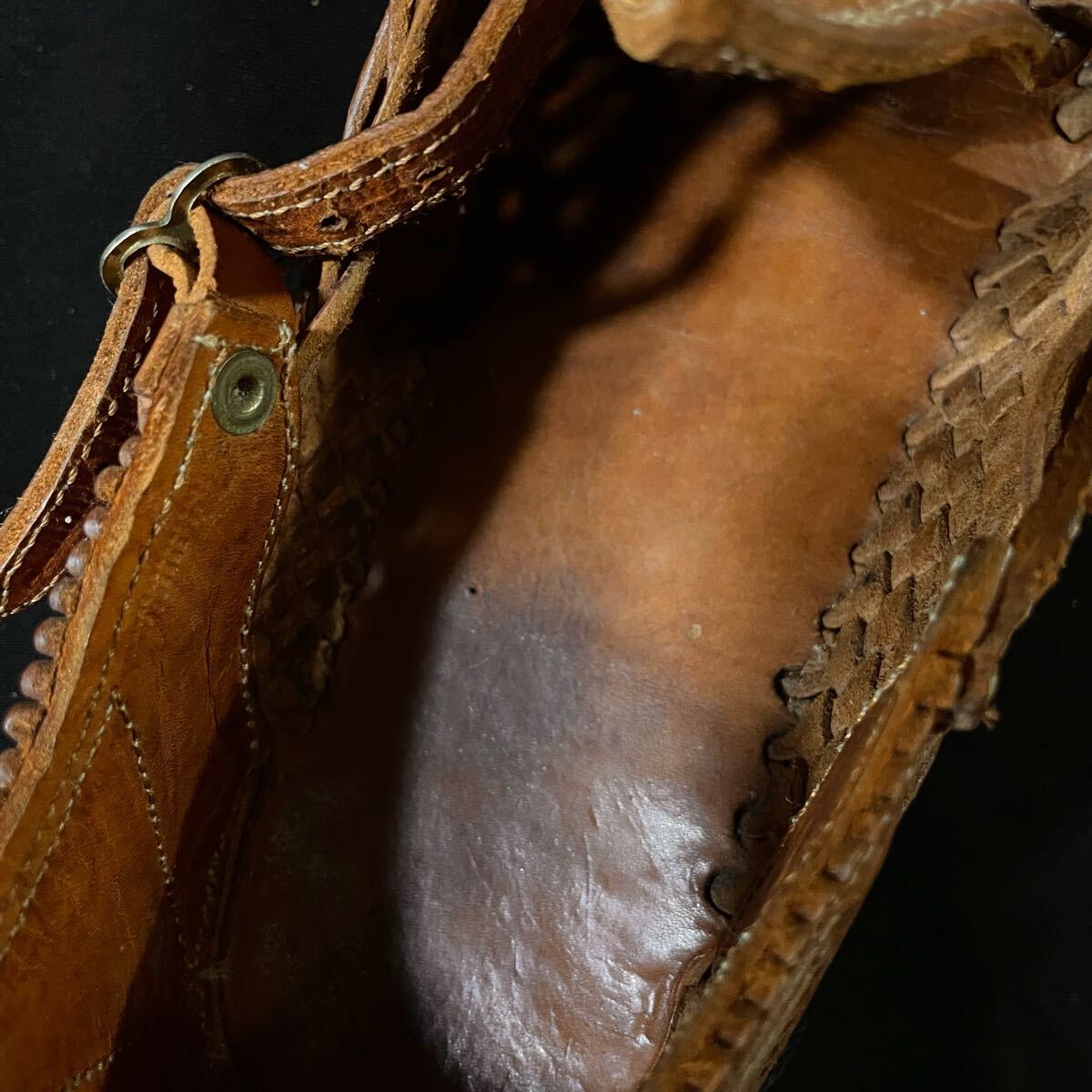 ・レザー特有の黒ずみやヒビ割れが見られます。