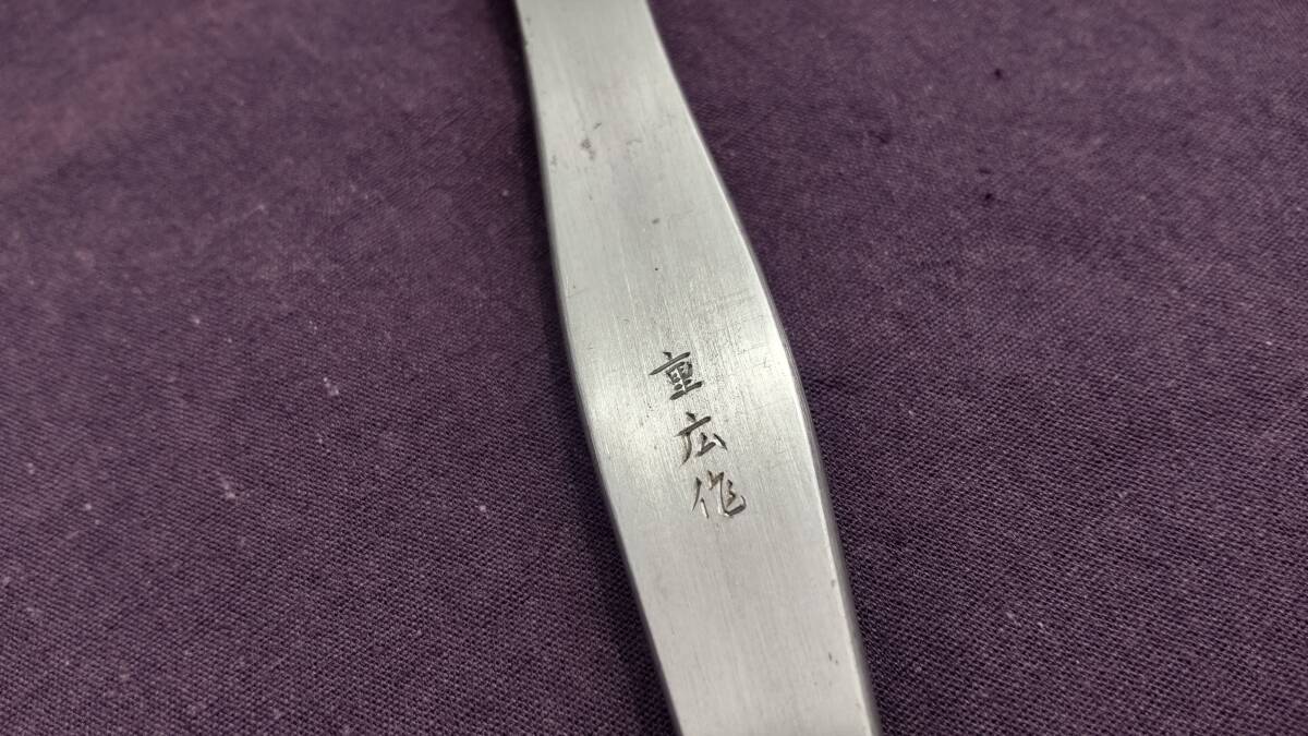 自分の調べでは作者は『冨山重太郎』という鍬など農具を作る一方、美術的な小刀も手掛ける越後の野鍛冶だったそうで「冨山」銘と「重広」銘を使い分けていたそうです。
