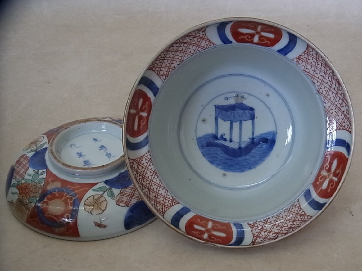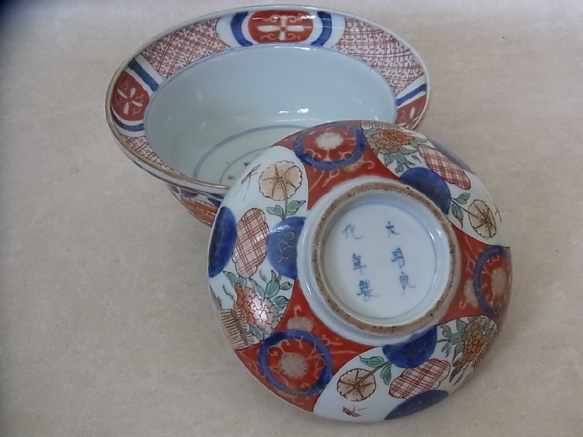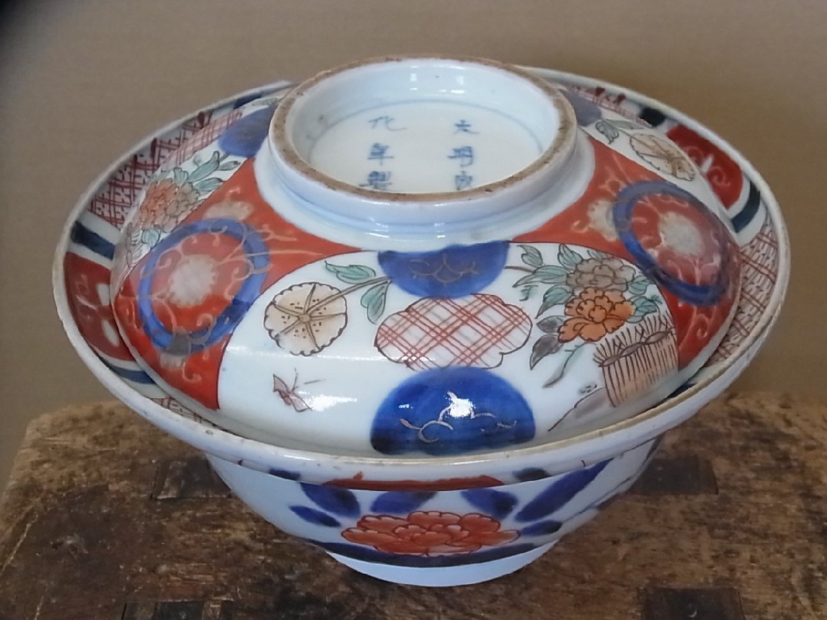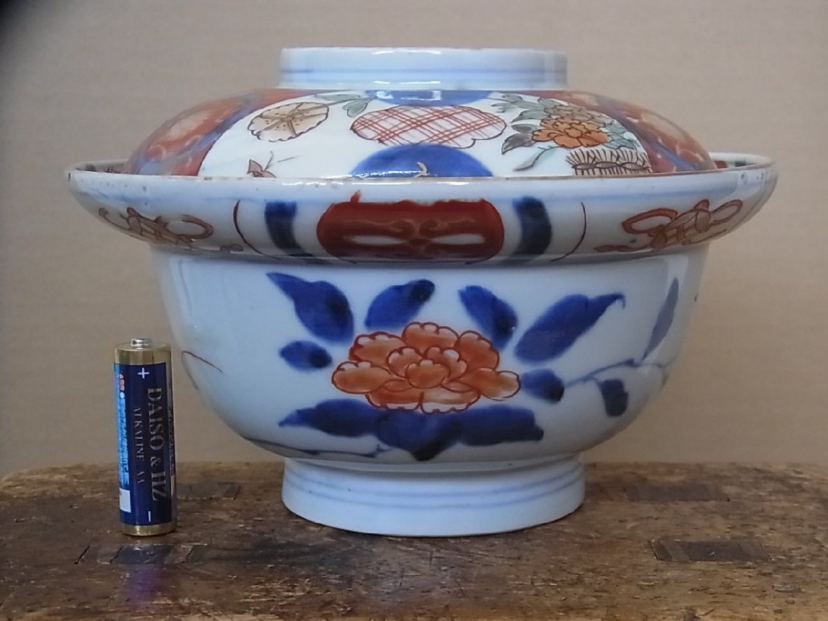 【蔵出し】 古伊万里 金襴手 蓋付き煮物椀 大明成化年製 屋形船/牡丹/花蝶文 直径/18.5cm
