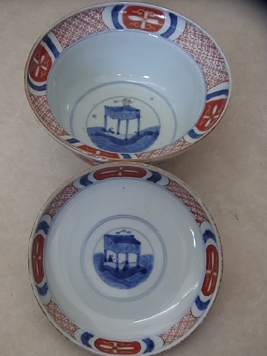 ◆ 古伊万里 金襴手 蓋付き煮物椀 大明成化年製 屋形船・花蝶文