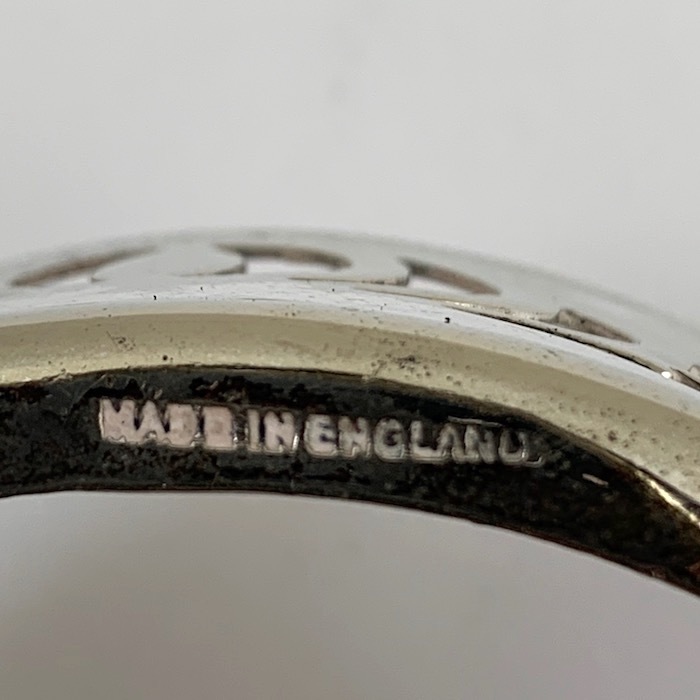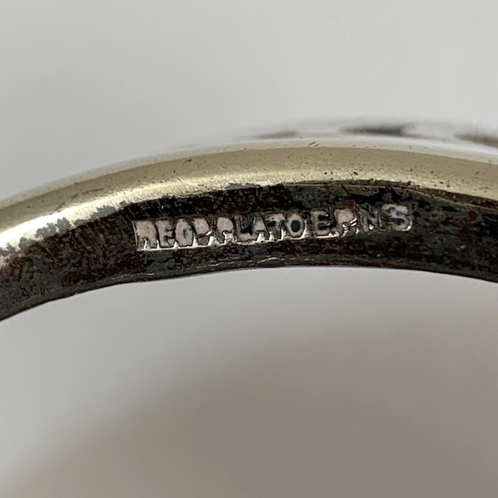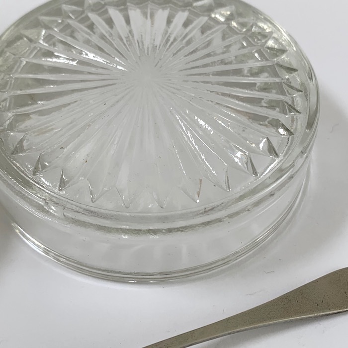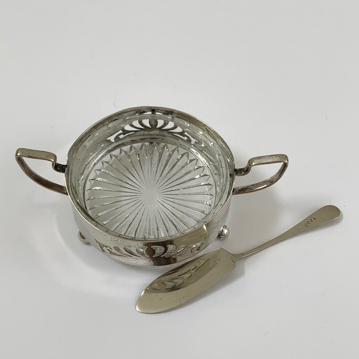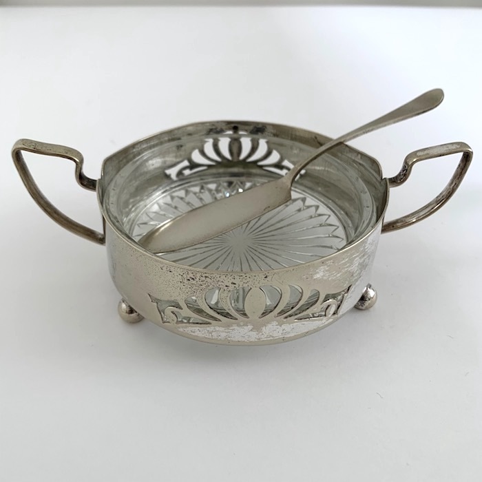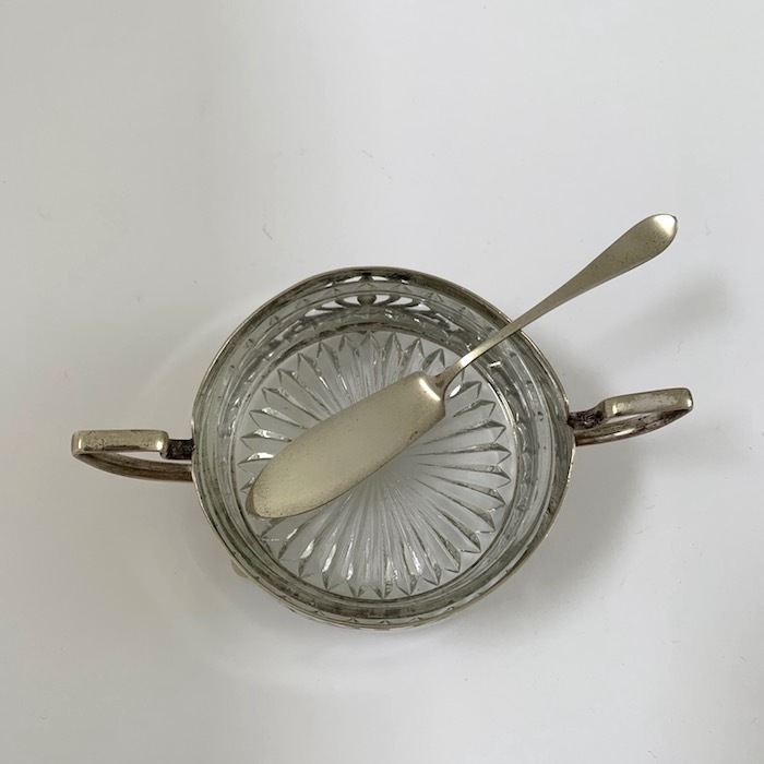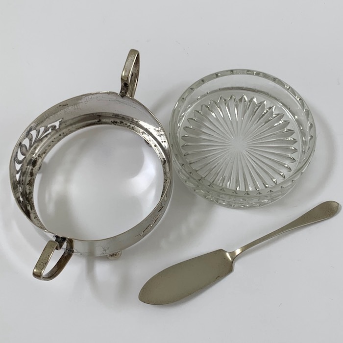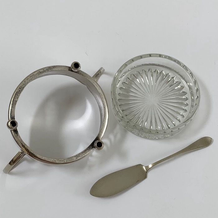 "REG.PLATO EPNS" "MADE IN ENGLAND"と刻印のあるシルバープレートの受けに、底に2ヶ所ほど小さな欠けのあるガラスの入れ物、それに"EPNS"の刻印のあるバターナイフのセットです。