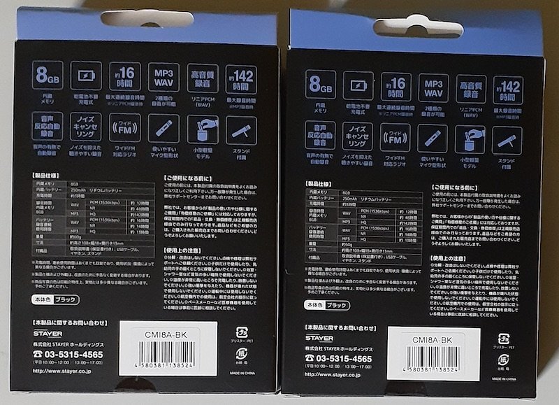 6378 ICレコーダー CMI8A-BK 2個セット 内蔵メモリ8GB マイク型 充電式 高音質録音リニアPCM(WAV) ノイズキャンセリング ワイドFM対応ラジオ STAYER