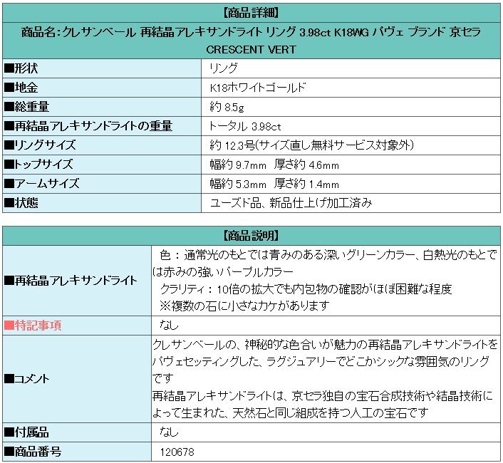 | 商品名:クレサンベール 再結晶アレキサンドライト リング 3.98ct K18WG パヴェ ブランド 京セラ CRESCENT VERT | |