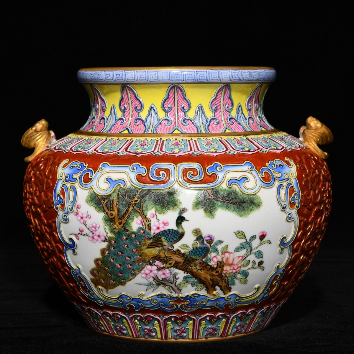 【瓏】陶磁器 漆紅浮彫描金開窗粉彩花鳥紋 蓋罐 大清乾隆年製 染付 置物擺件 古賞物 古美術 陶芸 蔵出