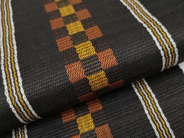 | 【正絹】 状態は締めてはおりますが 特に目立ったシミ汚れなどもなく大変良い状態です。 黒八丈(椎の木染) 黒八丈は、西條吉広さんが一番得意としている色で、 二十年の歳月を掛けて何よりも、そして誰よりも 艶やかに仕上げる黒を生み出しました。 方法は、まず椎木の皮を剥ぎ、煮詰めて染料を作ります。 実際のふし付けは40回。 まず、たるに絹糸を沢庵を漬けるように平らに並べます。 その上に熱湯になった椎の木の煮汁をひたひたになるほど掛け、 その上に、糸を互い違いに載せます。 その上からまた熱湯の煮汁を掛け、糸を入れ。 これを繰り返し、樽が一杯になるまで続けます。 最後に上から布を張って一昼夜寝かして置きます。 一回ごとに椎の皮を代え、煮汁を作り、 染めると言うこの工程を40回繰り返し、 最後に八丈島の泥田(鉄分が入っている)から持ってきた泥水に漬け込んで 色止めをし、仕上げます。 大変風合いの良い極上の逸品になります。 お安く出品致しますので、是非この機会にいかがでしょうか?