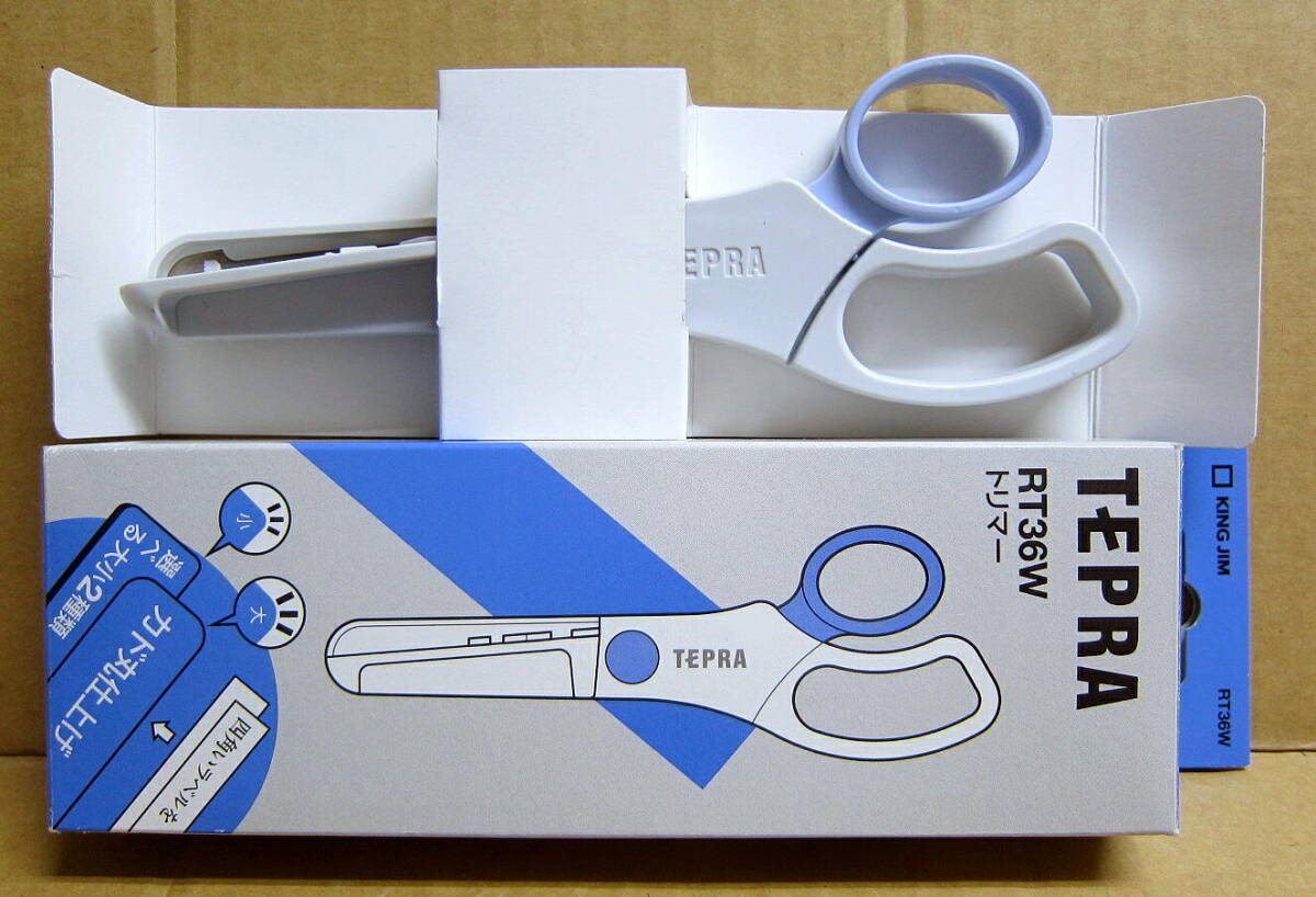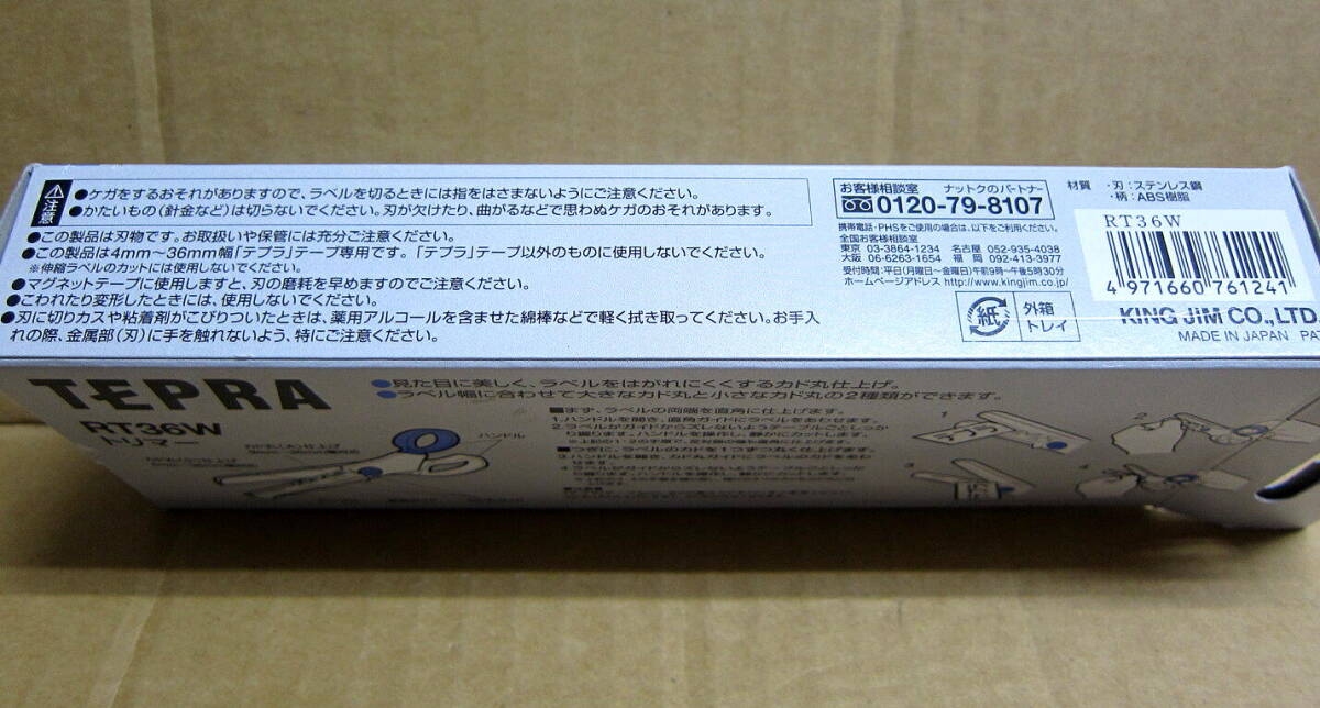 KING JIM、TEPRAオプションのトリマー、RT36W。 箱には若干のキズなどありますが未使用新品です。 買ってはみたものの、既に持っていたCASIOネームランドの類似製品で用が足りていたため、結局使わずじまいでした。 テープ適応幅は4~36mm。 直線カットと角丸カット大小2種のカットが出来ます。 テプラのオプションですが、もちろんネームランドなど他社の同様のテープ製品にも使えます。 | |||||