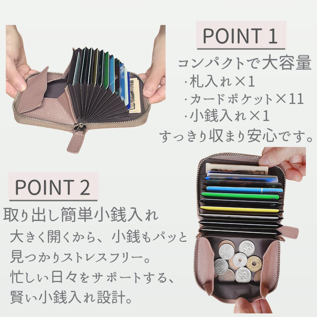 シンプルな見た目ながら、11枚のカードが収納できるカードポケット、お札入れ、小銭入れ、外ポケットまで備えた大容量設計。
