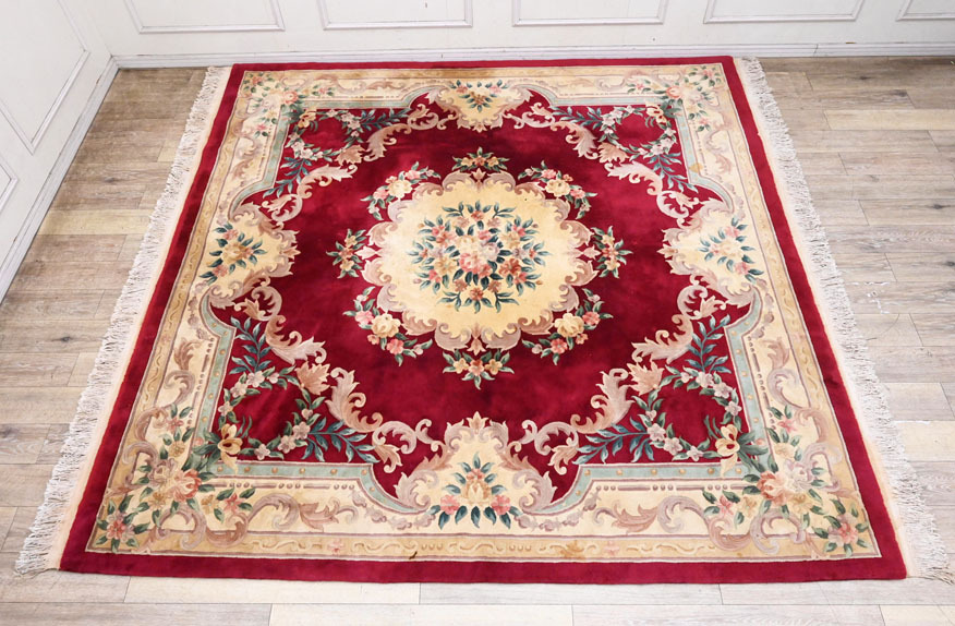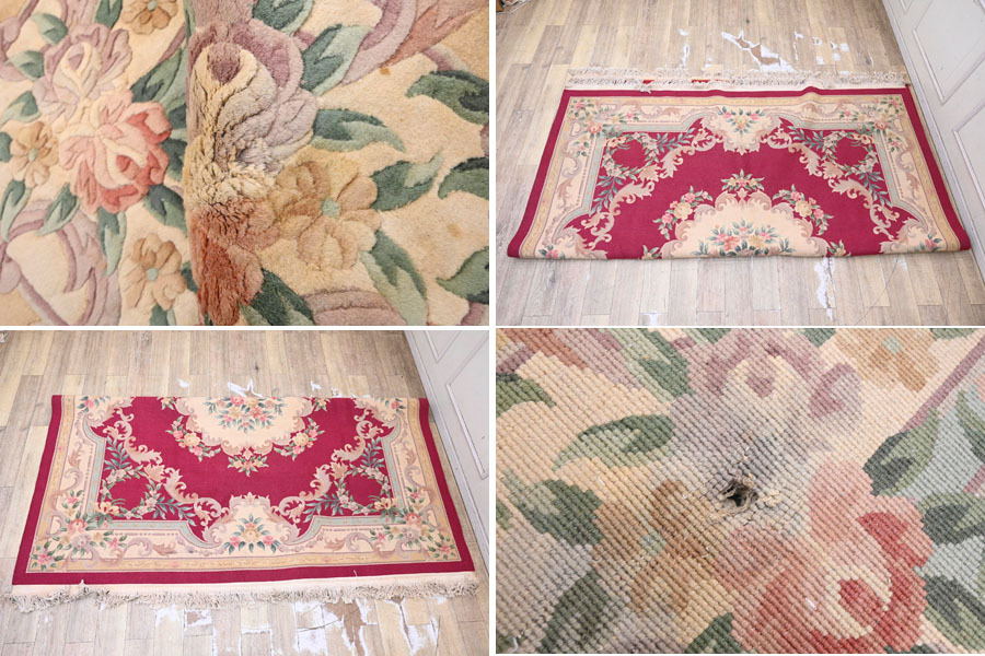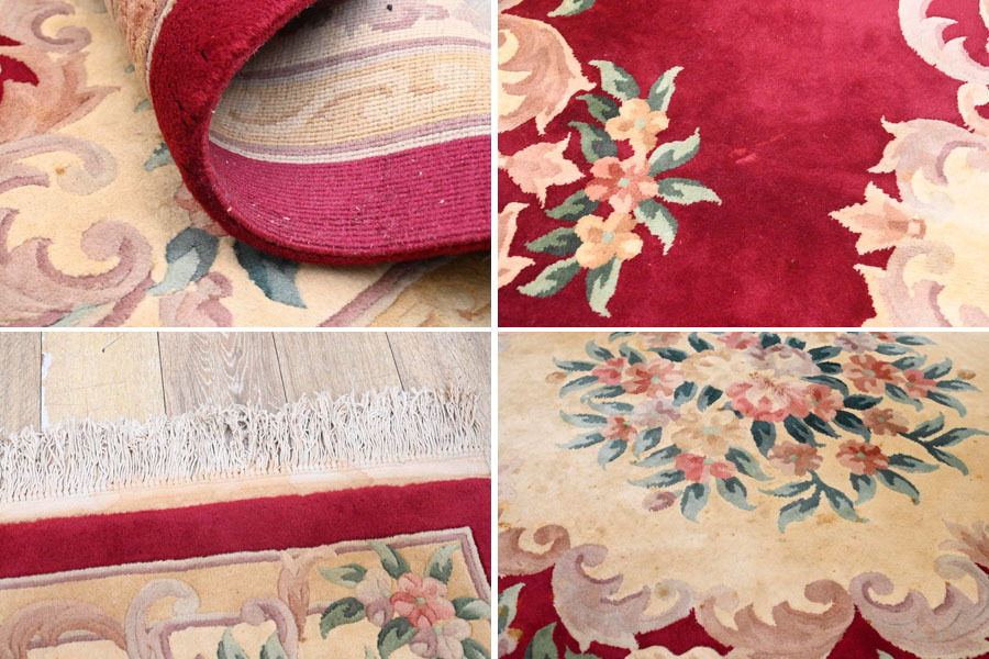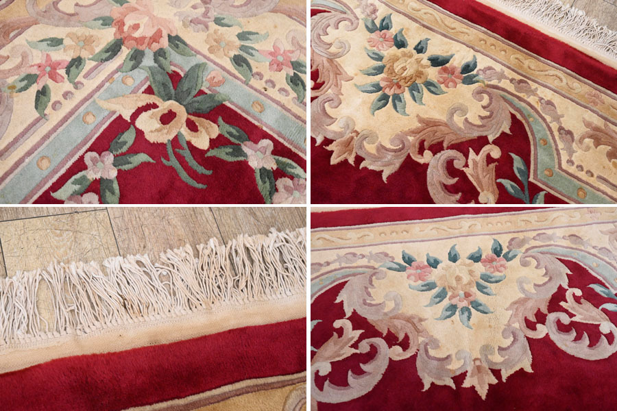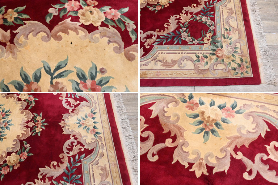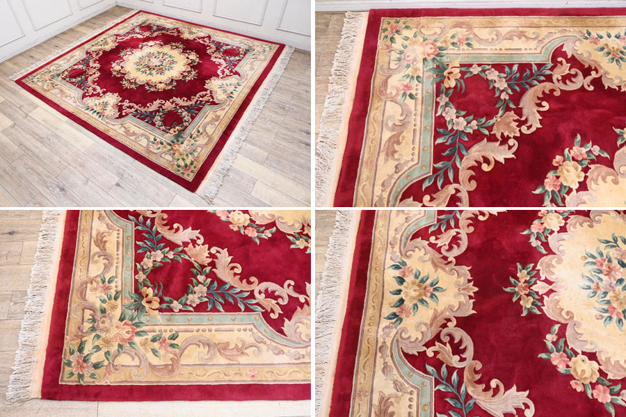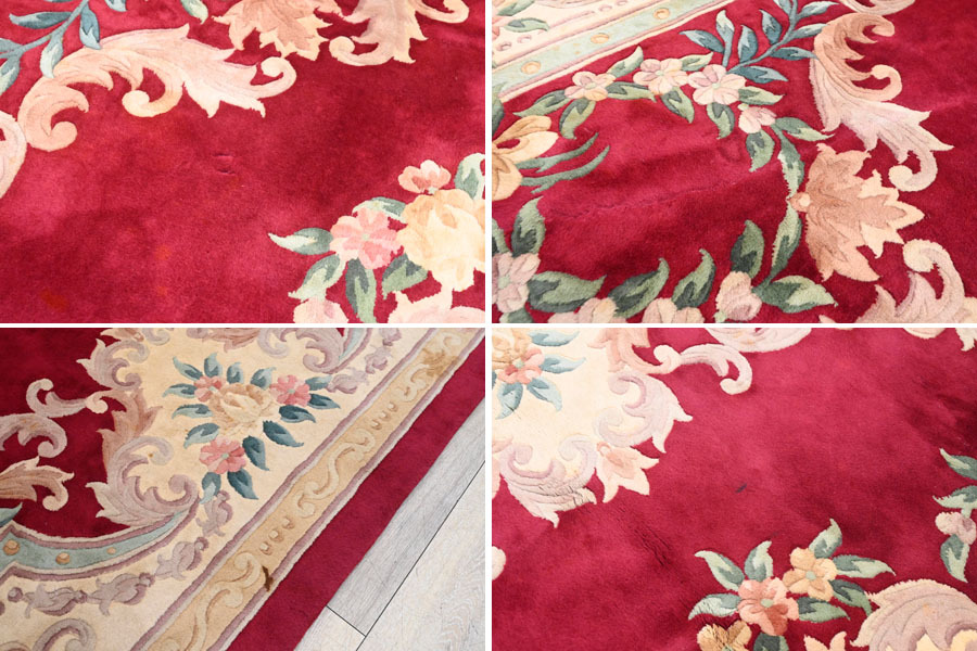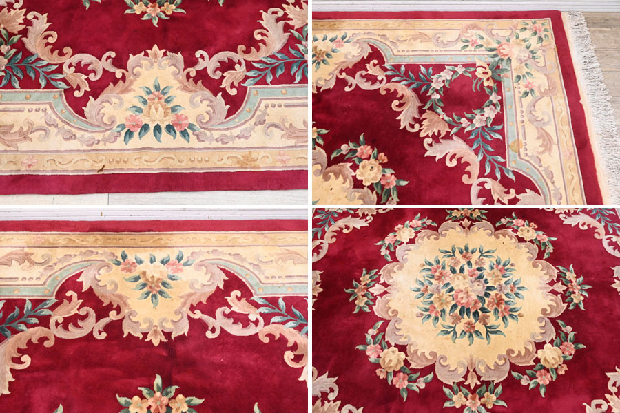 ----------------------------------------------------------------------------------------- ●送料や注意事項は必ずご確認下さい。落札後にトラブルになるケースが増えております。● ◆コンディションは写真・文章にて記載して有りますが、全てのキズの写真は掲載致しておりません。大きなダメージを除き見落とし、記載漏れが有る事はご了承下さい。 ◆当サイトにて出品する商品は多種多彩で、当方商品知識の無い物も多数ありますので落札後の質問やメンテナンス等にはお答えできません。 ◆入札された時点で、画像、文章をご理解していただいたものと判断させていただきます。不明な点は前もってQ&Aからお願い致します。入札後の質問やお電話等でのキャンセルは一切受け付け致しません。 ◆商品説明に「ノークレーム」と記載しているものに関しては、如何なる状況で届いても保証致しません。詳しくは注意事項の「商品到着後について」の最後に記載しておりますのでご確認下さい。 ---------------------------------------------------------------------------------------- ハンドメイドで織り上げられたウール製の段通、中古品の出品です。 古来より「幸福」や「長寿」と言った人々の願いを込めて一つ一つ丁寧に丹念に仕上げられた、 悠久への思いの込められた中国伝統の工芸品です。 その光沢と織り目の密度の高さは三大最高級絨毯(ペルシャ・中国・トルコ) の中でも定評があります。 また、世代を超えて受け継がれるほどに堅牢なもので、お手入れしだいでは 何十年も使えると言われています。 【コンディション】 中古品ですのでシミ、ヨゴレ、保管臭、所々置き跡、裏面穴開き(表面まで影響有り)等、使用に伴うダメージ有ります。 当方でクリーニング等はしておりませんので、クリーニング前提でお考え下さい。 | ||